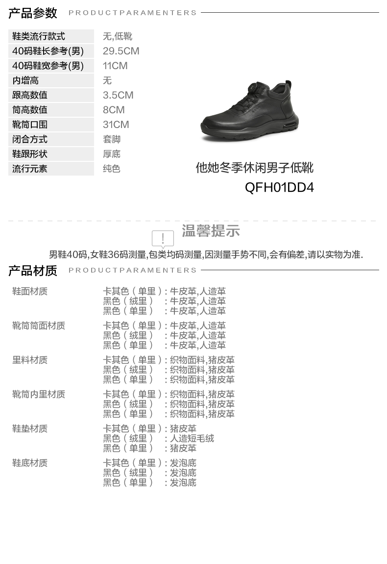 | 闭合方式:套脚 | 40码鞋宽参考(男):11CM | 靴筒口围:31CM | 上市时间:2024年冬季 | 鞋类流行款式:低靴时装靴 |
