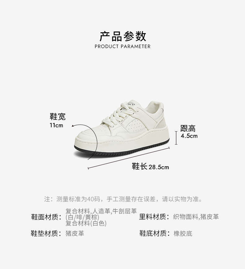 | 风格:休闲 | 色系:白色 | 跟高数值:4.5CM | 40码鞋宽参考(男):11CM | 性别:男子 |