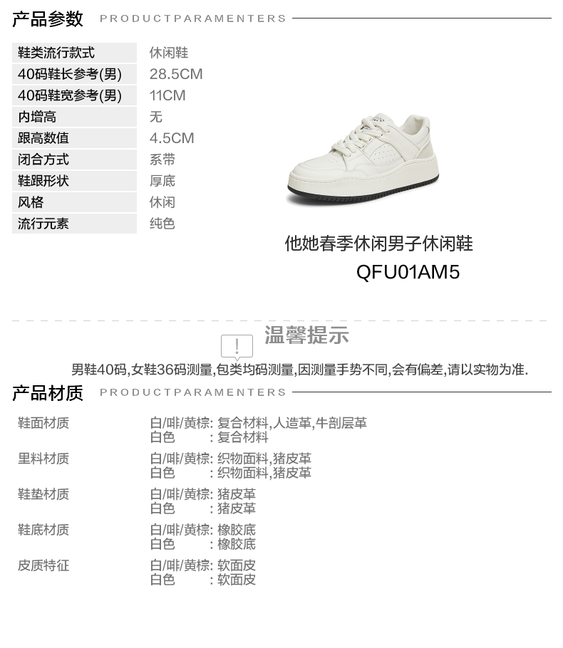 | 风格:休闲 | 色系:白色 | 跟高数值:4.5CM | 40码鞋宽参考(男):11CM | 性别:男子 |