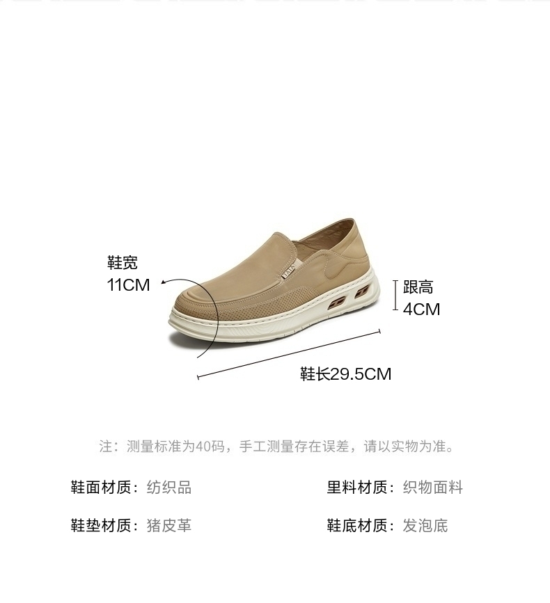 | 风格:休闲 | 色系:杏色 | 跟高数值:4CM | 40码鞋宽参考(男):11CM | 性别:男子 |