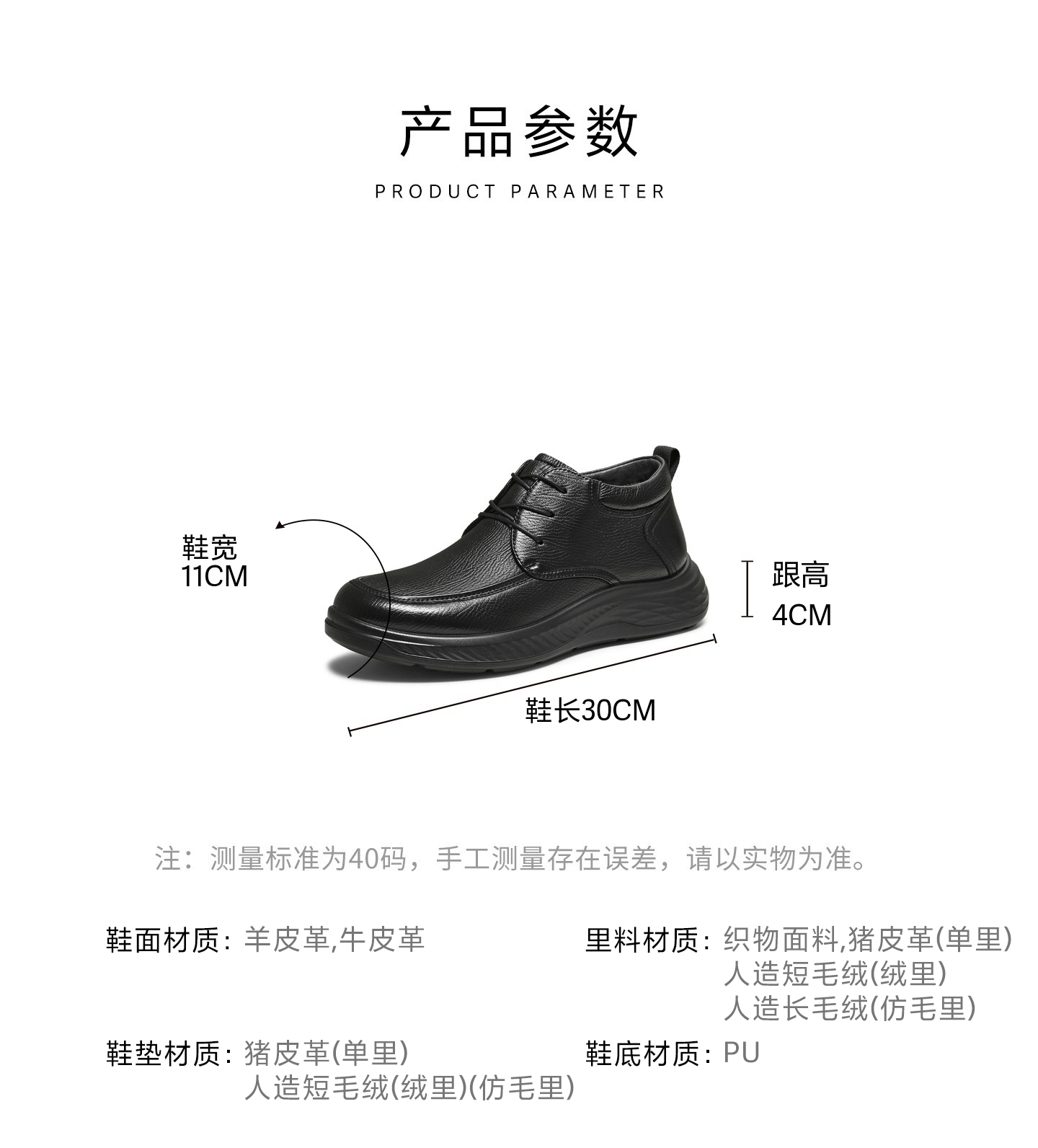 | 风格:休闲 | 色系:黑色 | 跟高数值:4CM | 40码鞋宽参考(男):11CM | 性别:男子 |