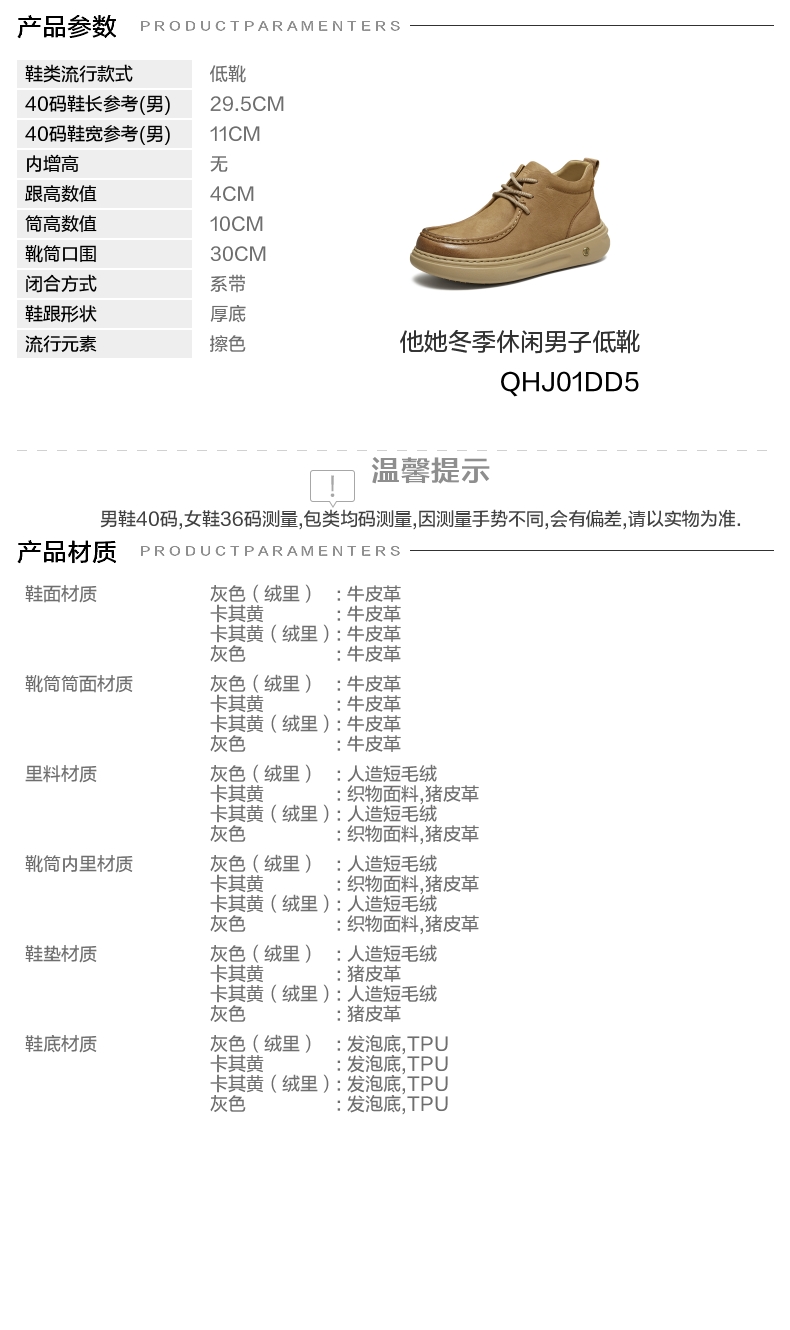 | 闭合方式:系带 | 40码鞋宽参考(男):11CM | 靴筒口围:30CM | 上市时间:2025年冬季 | 鞋类流行款式:低靴 |