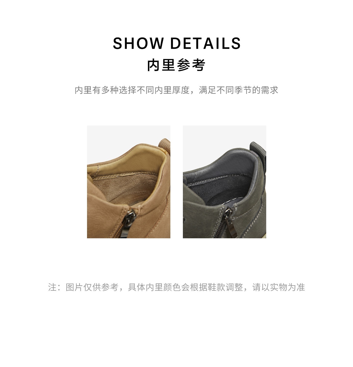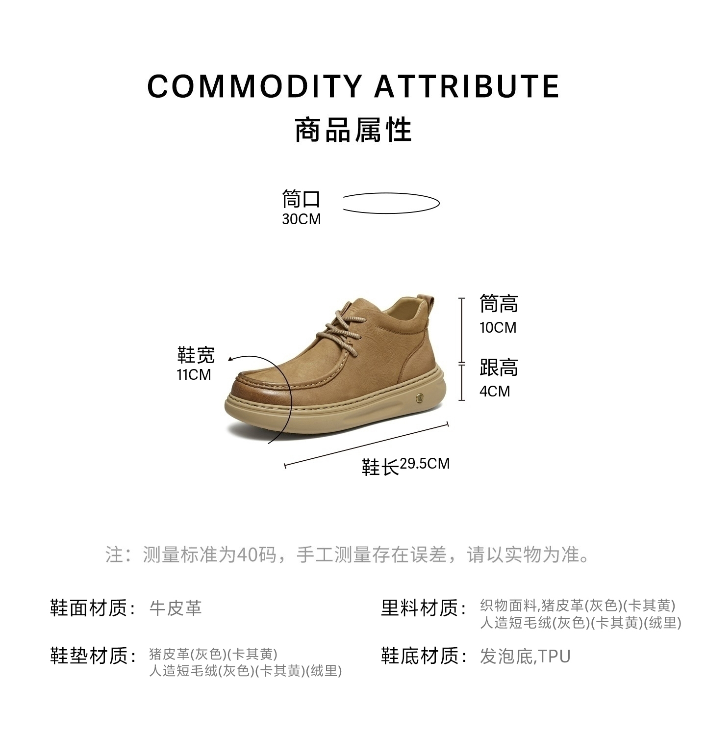 | 鞋面内里材质:猪皮革 | 跟高数值:4CM | 色系:卡其 | 性别:男子 | 筒高数值:10CM |