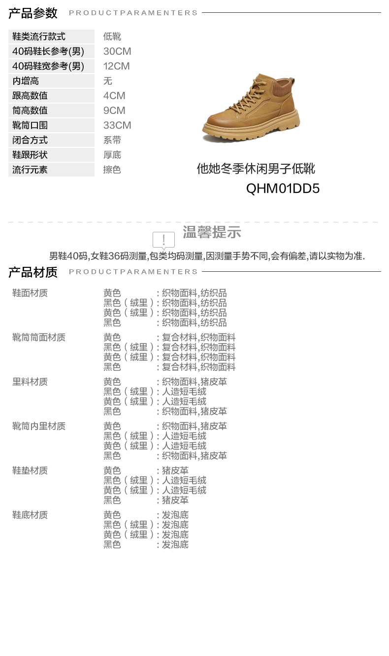 | 闭合方式:系带 | 40码鞋宽参考(男):12CM | 靴筒口围:33CM | 上市时间:2025年冬季 | 鞋类流行款式:低靴 |