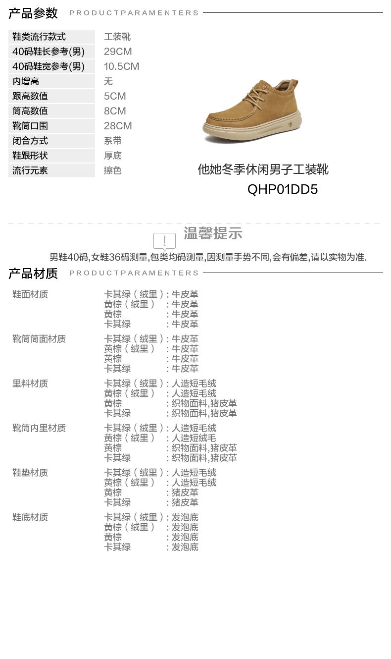 | 闭合方式:系带 | 40码鞋宽参考(男):10.5CM | 靴筒口围:28CM | 上市时间:2025年冬季 | 鞋类流行款式:工装靴 |