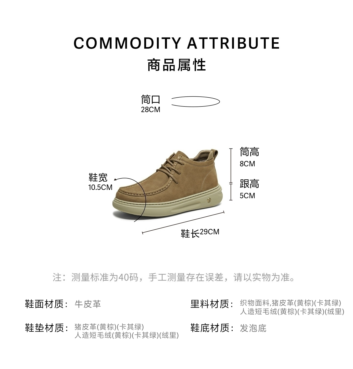 | 40码鞋长参考(男):29CM | 鞋底材质:发泡底 | 靴筒内里材质:猪皮革织物面料 | 内增高:无 | 鞋面材质:牛皮革 |