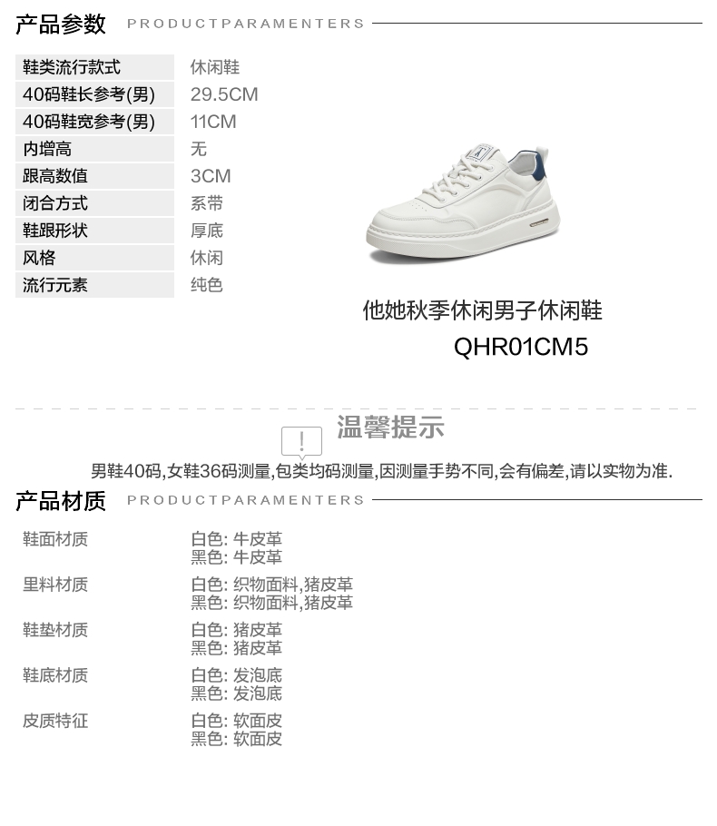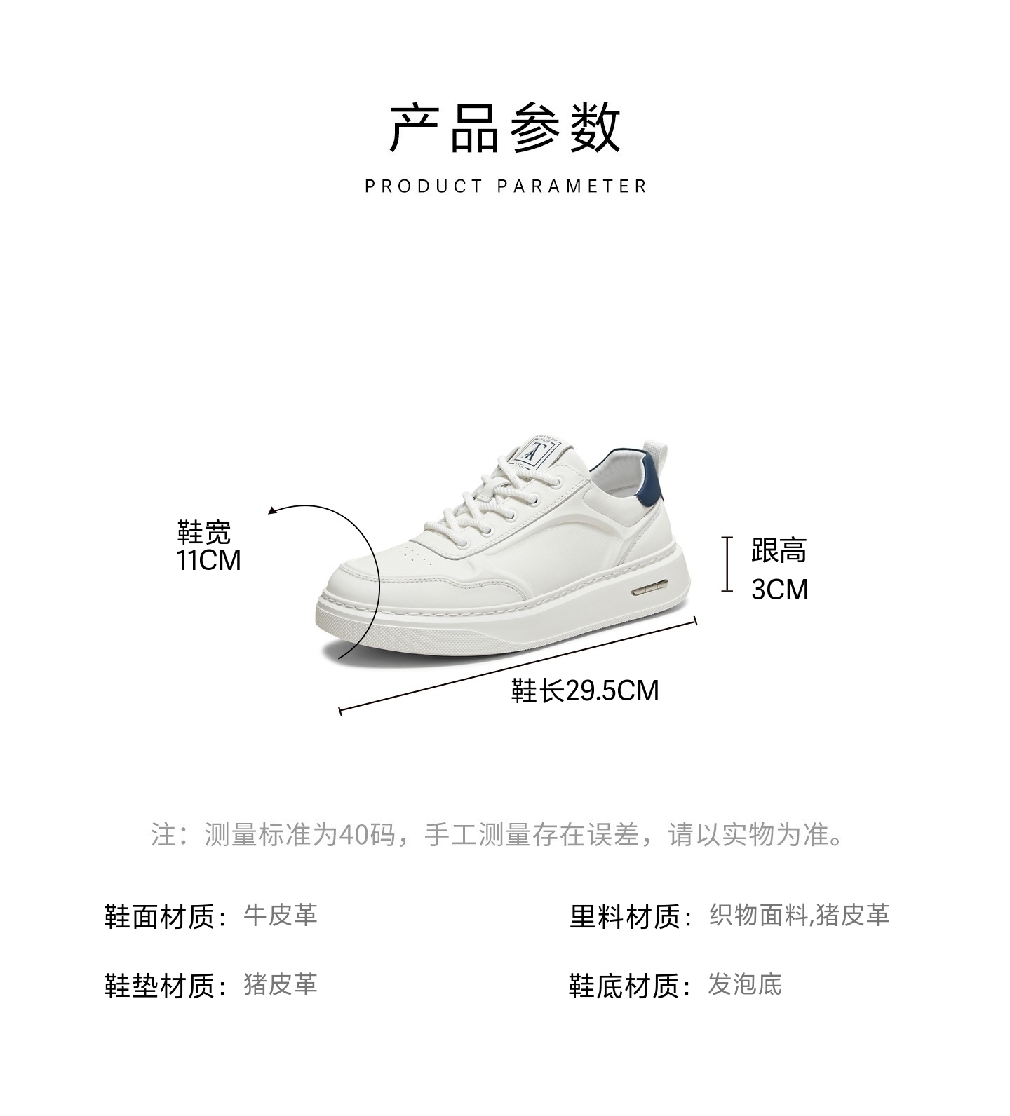 | 风格:休闲 | 色系:白色 | 跟高数值:3CM | 40码鞋宽参考(男):11CM | 性别:男子 |
