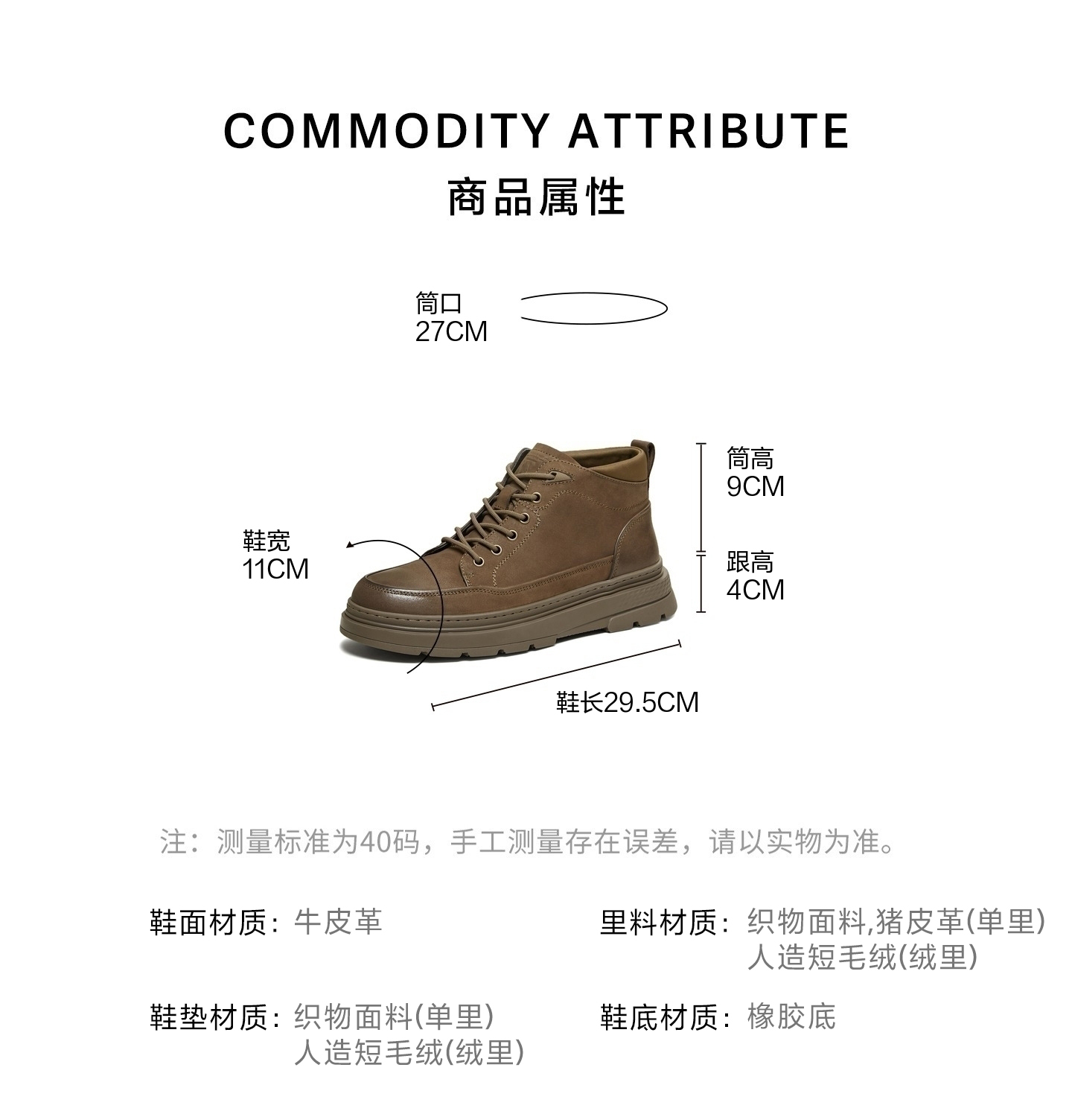 | 闭合方式:系带 | 40码鞋宽参考(男):11CM | 靴筒口围:27CM | 上市时间:2025年冬季 | 鞋类流行款式:低靴 |