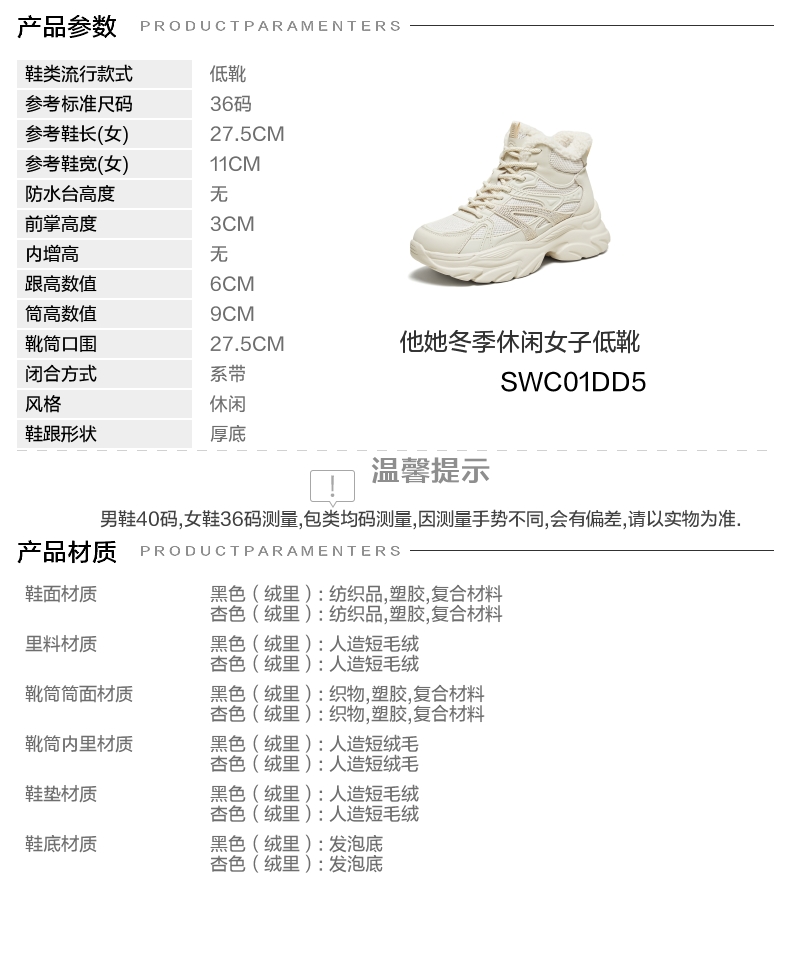 | 帮面材质:复合材料织物 | 配跟:无 | 靴筒口围:27.5CM | 上市时间:2025年冬季 | 鞋类流行款式:低靴 |