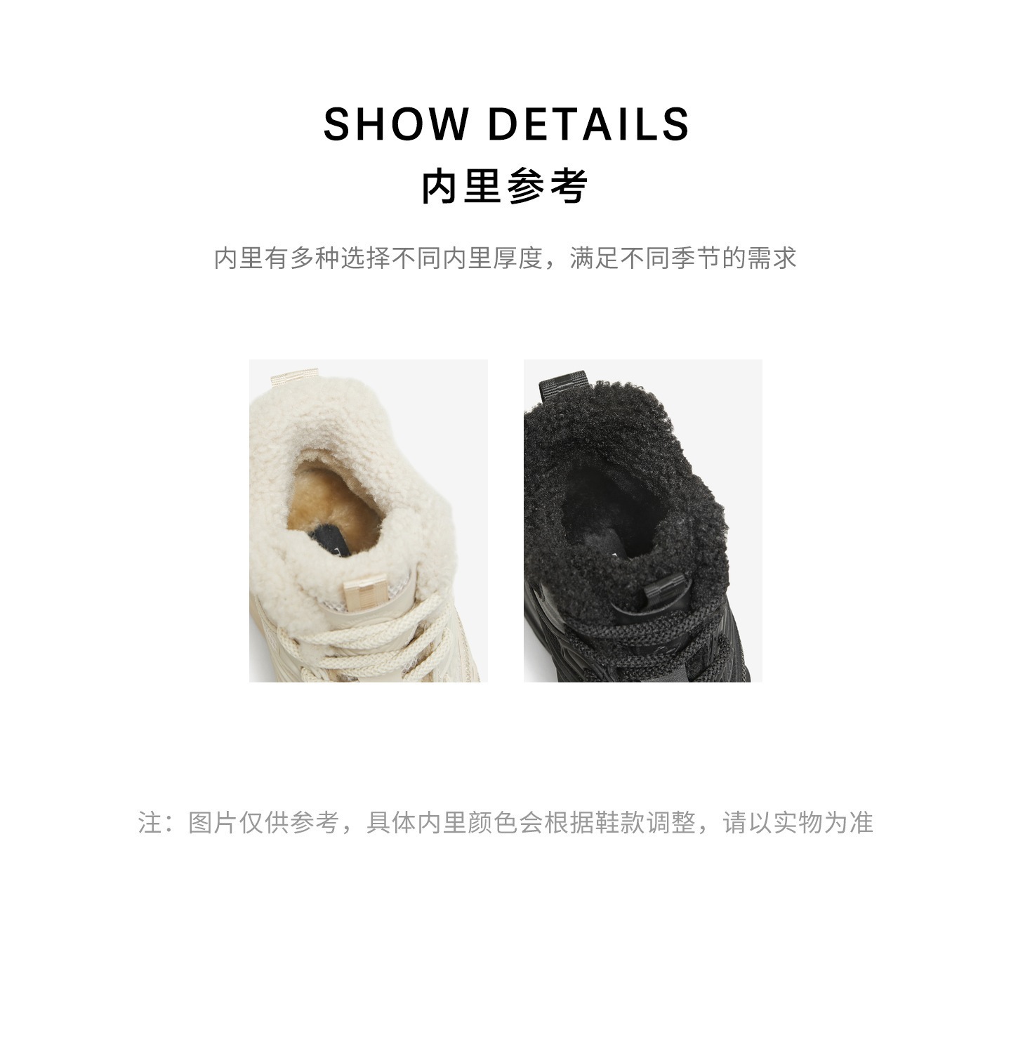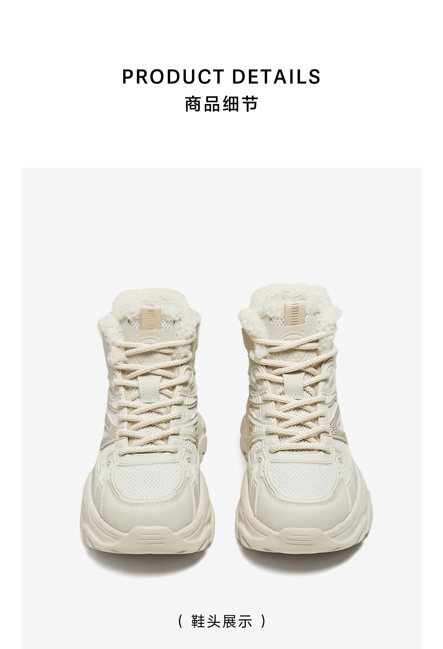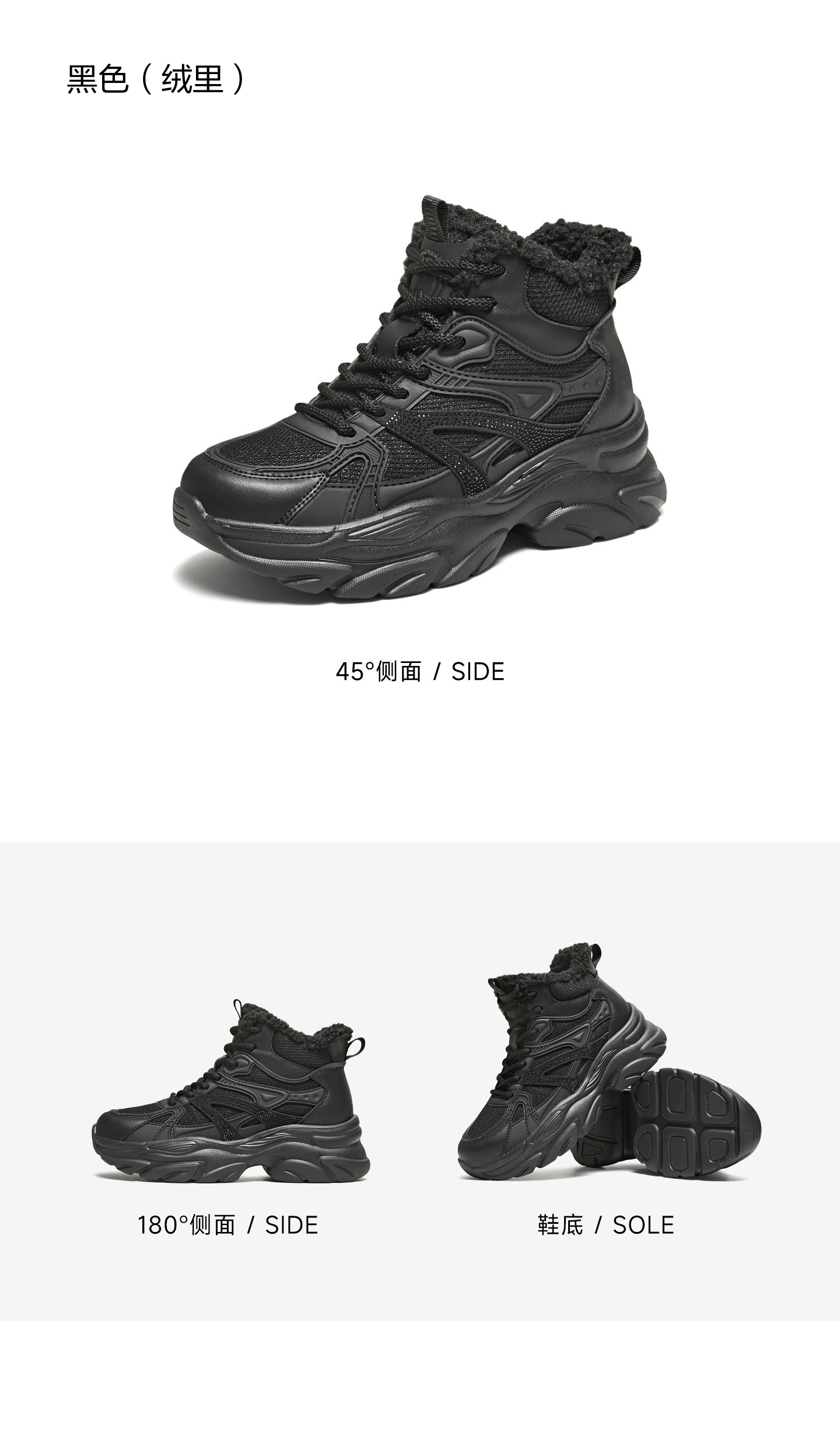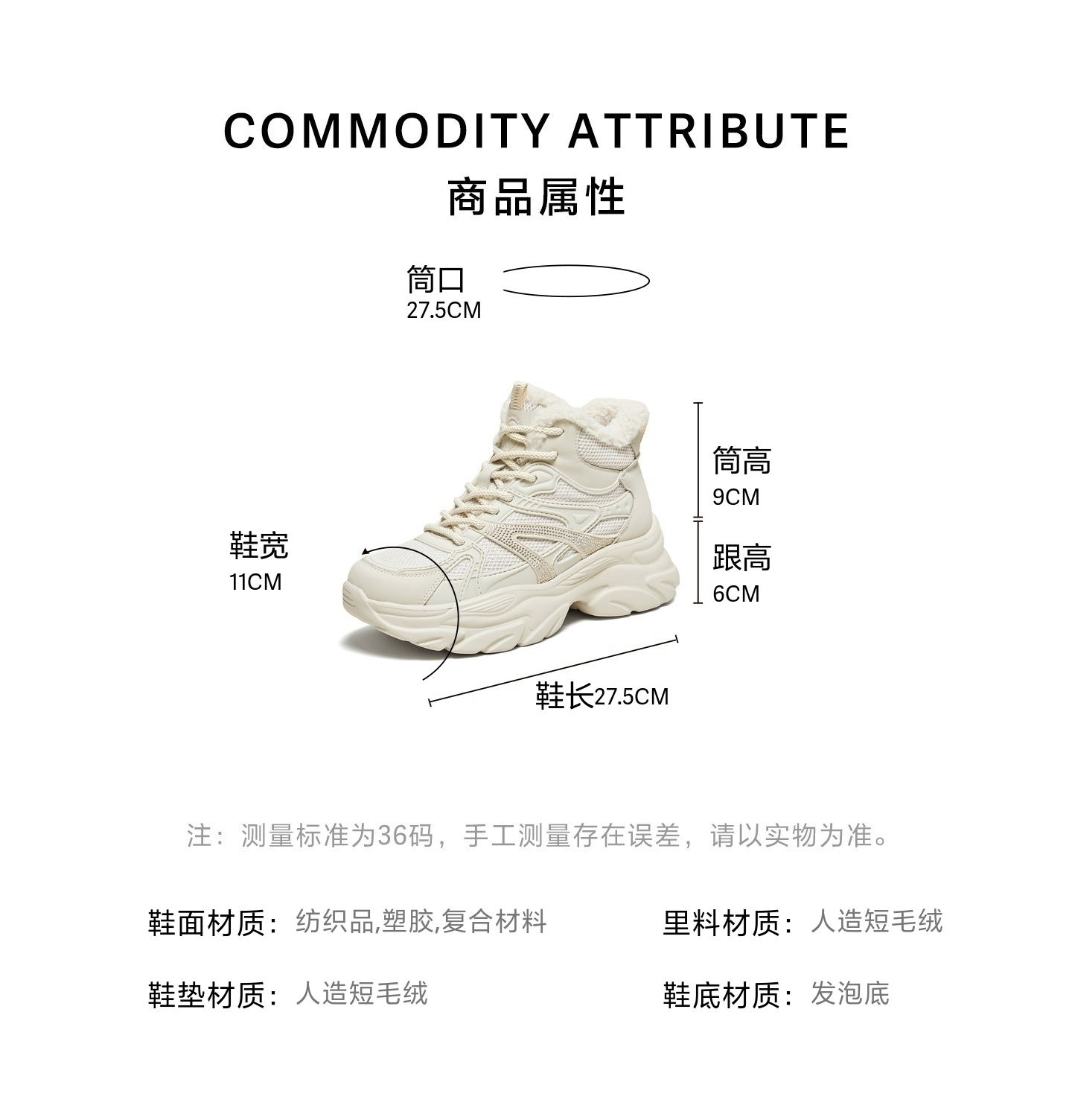 | 鞋底材质:发泡底 | 靴筒内里材质:人造短绒毛 | 内增高:无 | 鞋面材质:纺织品复合材料塑胶 | 闭合方式:系带 |