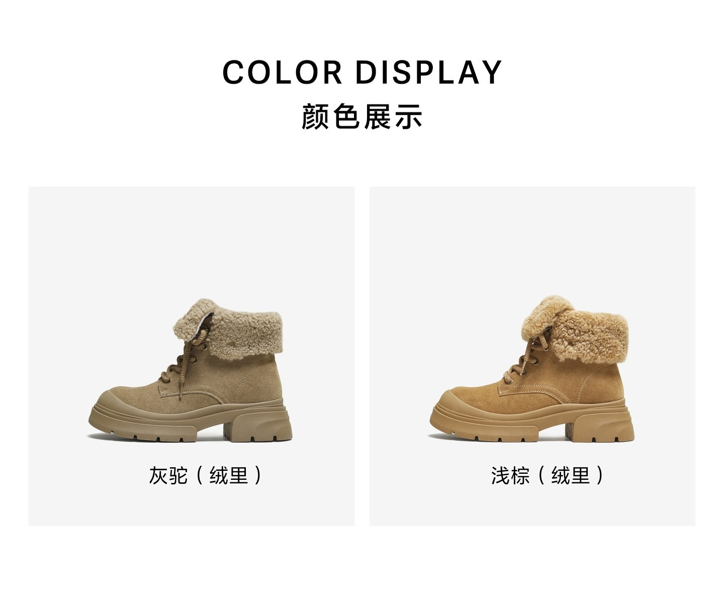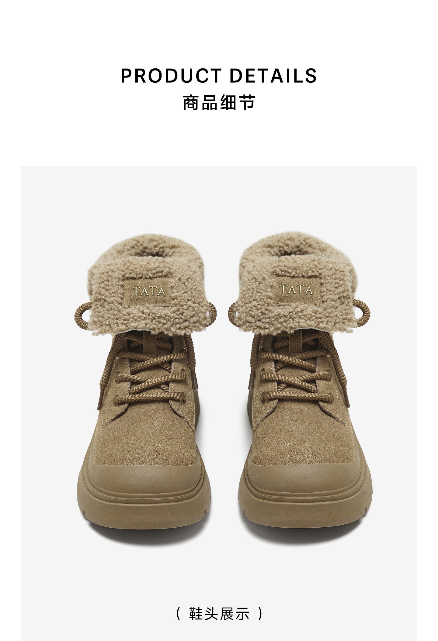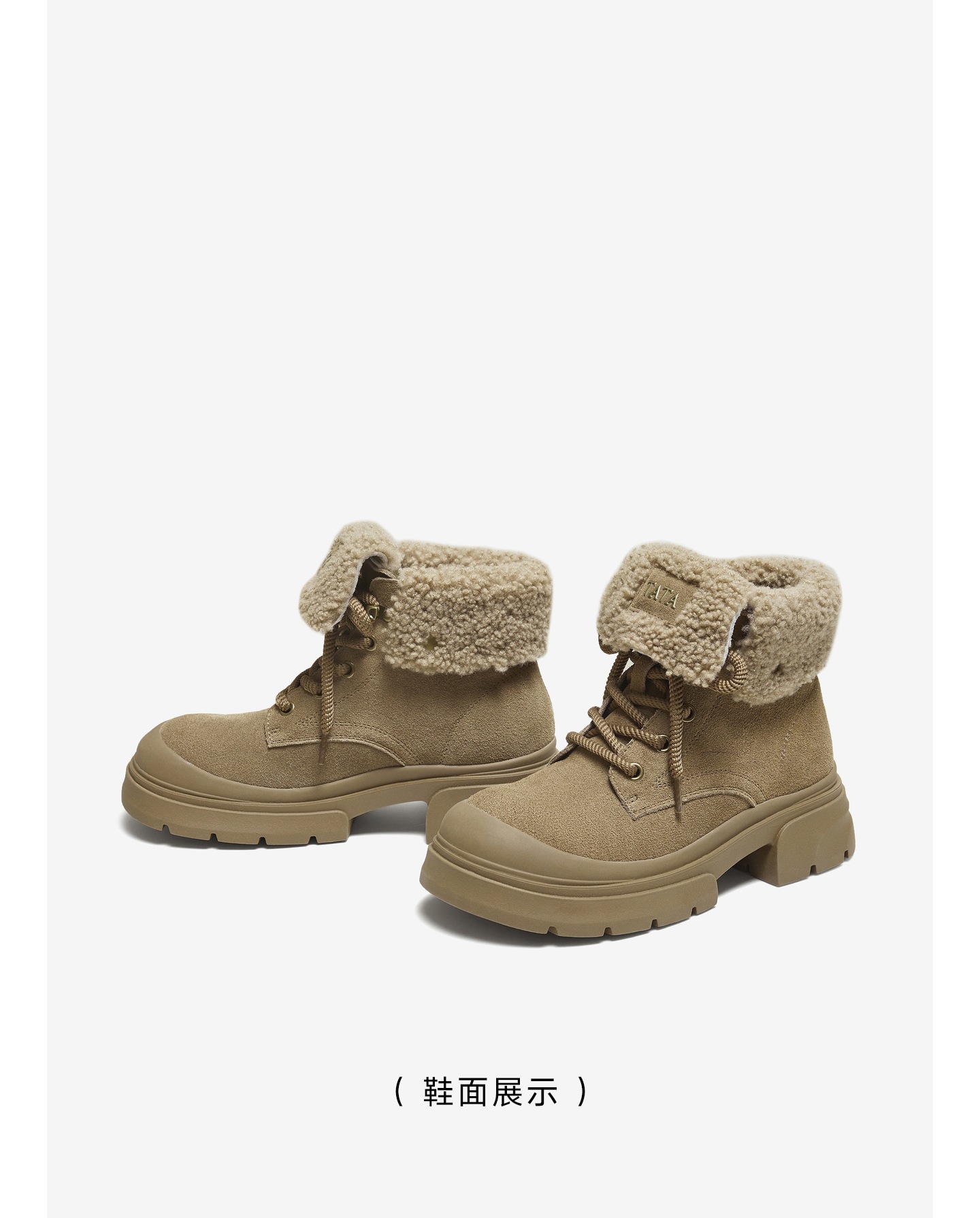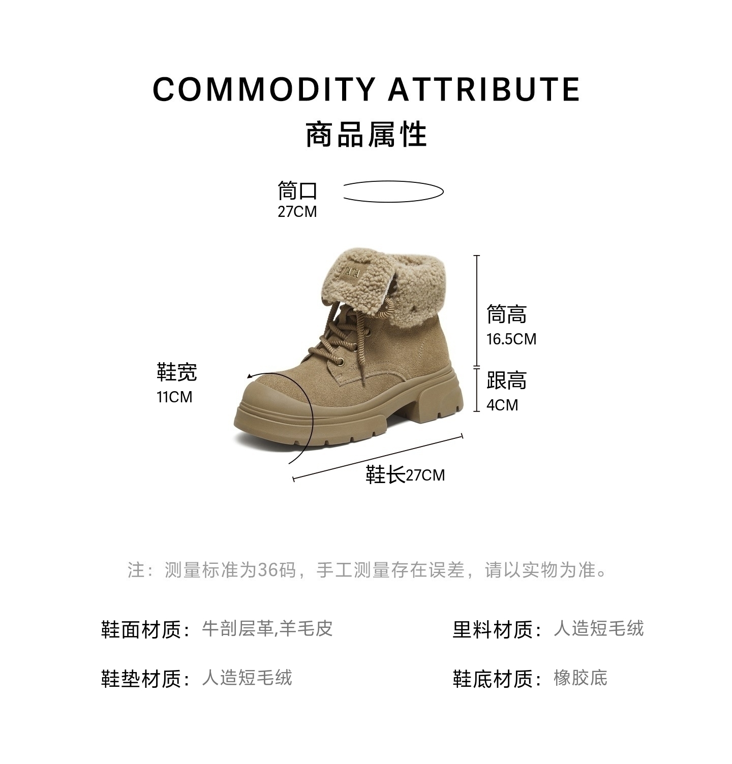 | 鞋底材质:橡胶底 | 靴筒内里材质:人造短毛绒 | 内增高:无 | 鞋面材质:羊毛皮牛剖层革 | 闭合方式:系带 |