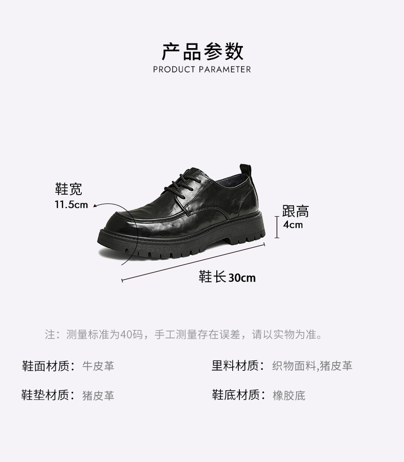 | 里料材质:猪皮革织物面料 | 上市时间:2025年春季 | 制鞋工艺:胶贴皮鞋 | 款式季节:春季 | 鞋垫材质:猪皮革 |
