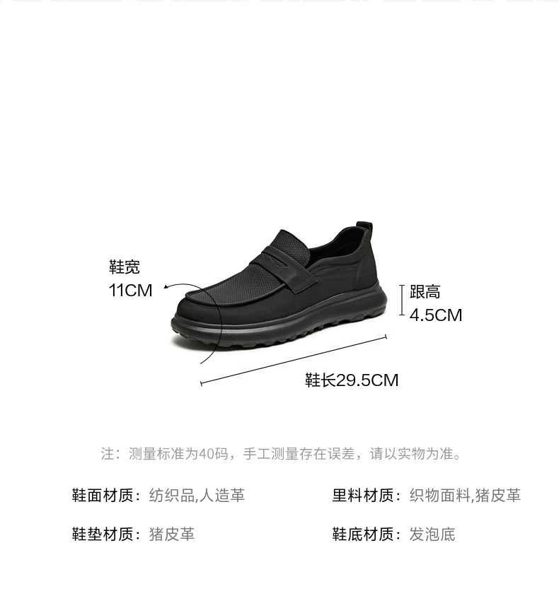 40码鞋长参考(男):29.5CM 鞋帮:低帮 鞋头款式:圆头 鞋底材质:发泡底 鞋面图案:纯色
