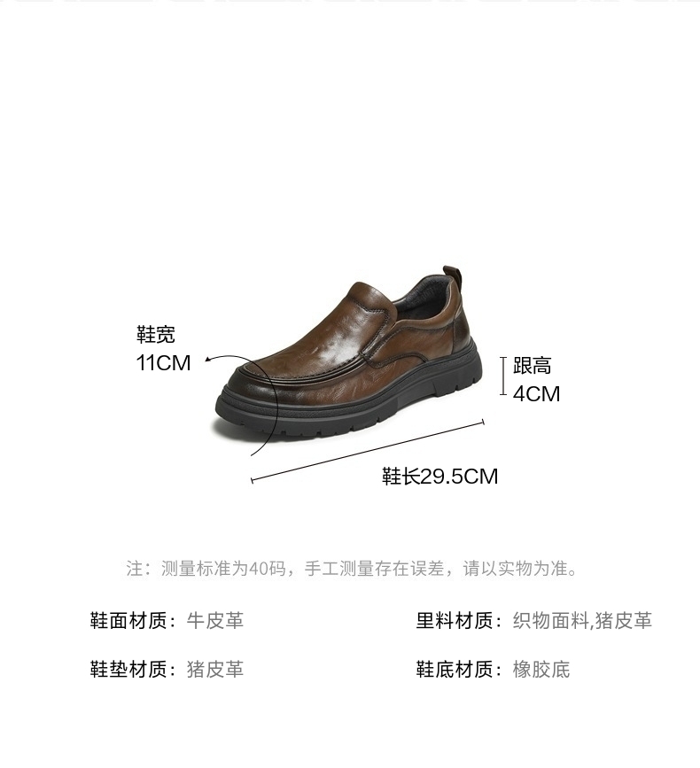 | 风格:休闲 | 色系:棕色 | 跟高数值:4CM | 40码鞋宽参考(男):11CM | 性别:男子 |