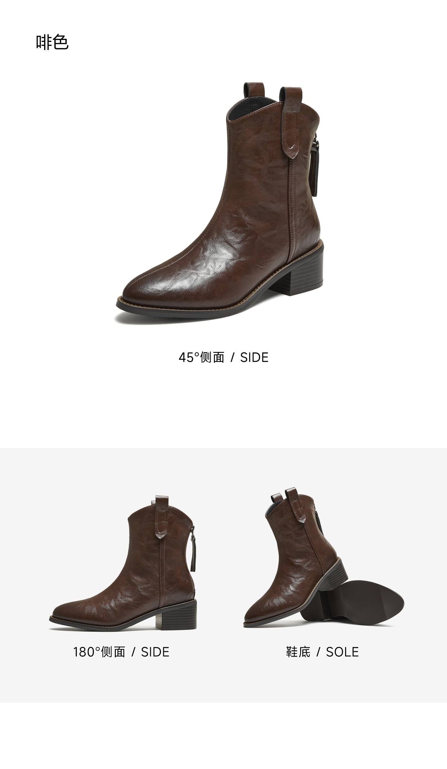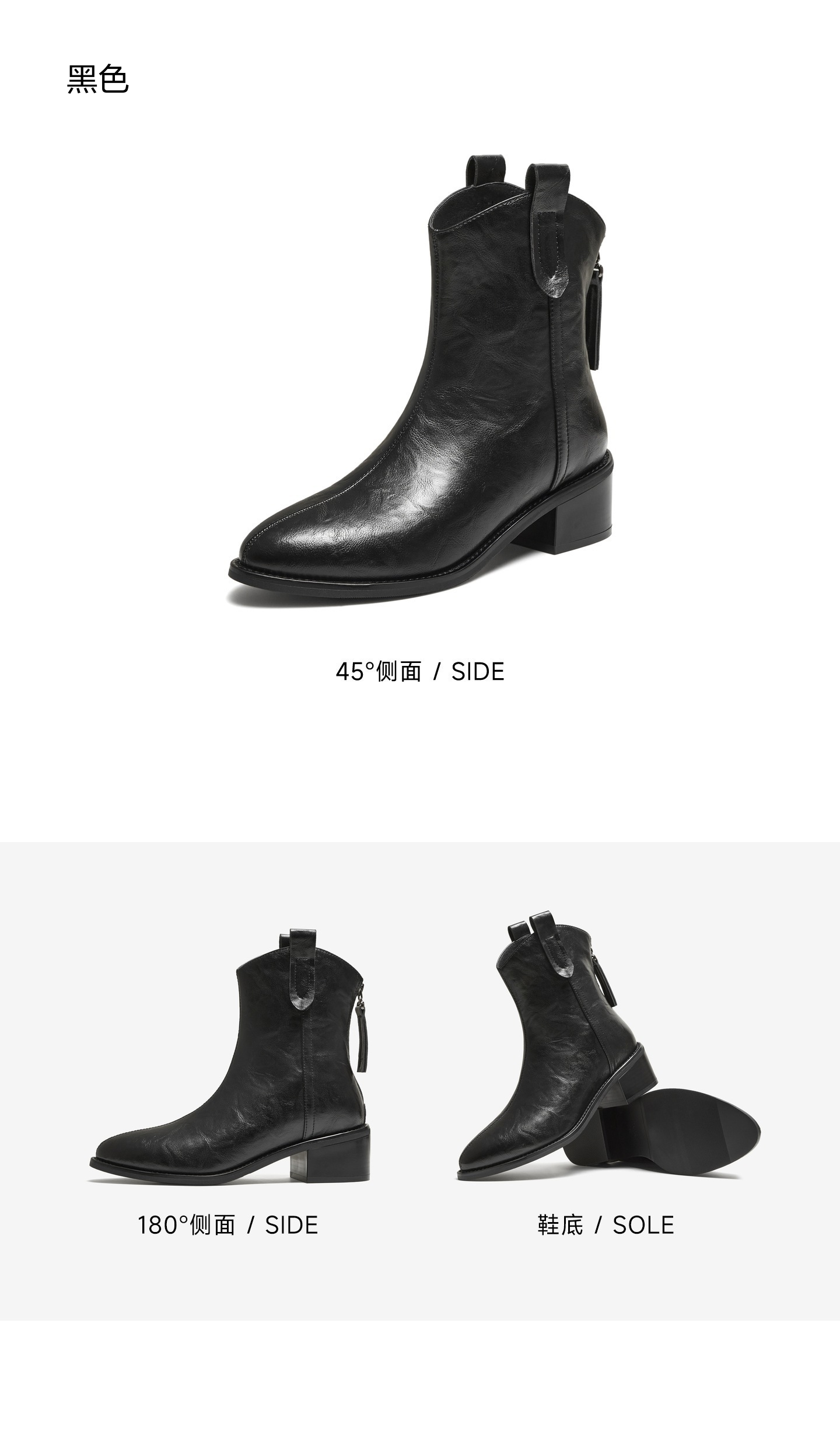 | 鞋底材质:橡胶底 | 靴筒内里材质:PU革织物面料 | 内增高:无 | 鞋面材质:人造革 | 闭合方式:后拉链 |