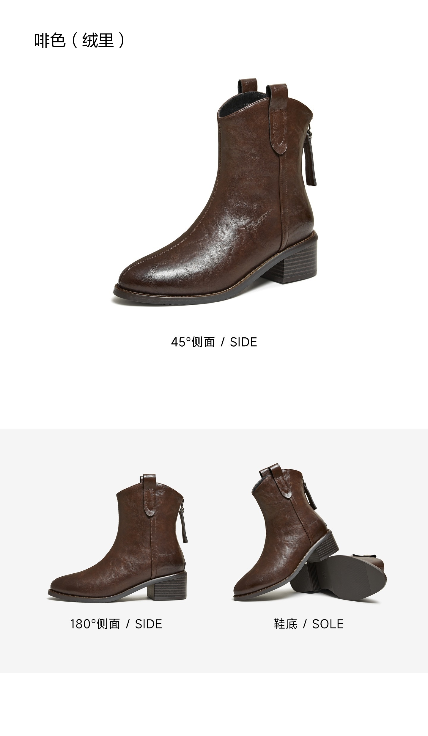 | 鞋底材质:橡胶底 | 靴筒内里材质:人造短毛绒 | 内增高:无 | 鞋面材质:人造革 | 闭合方式:后拉链 |