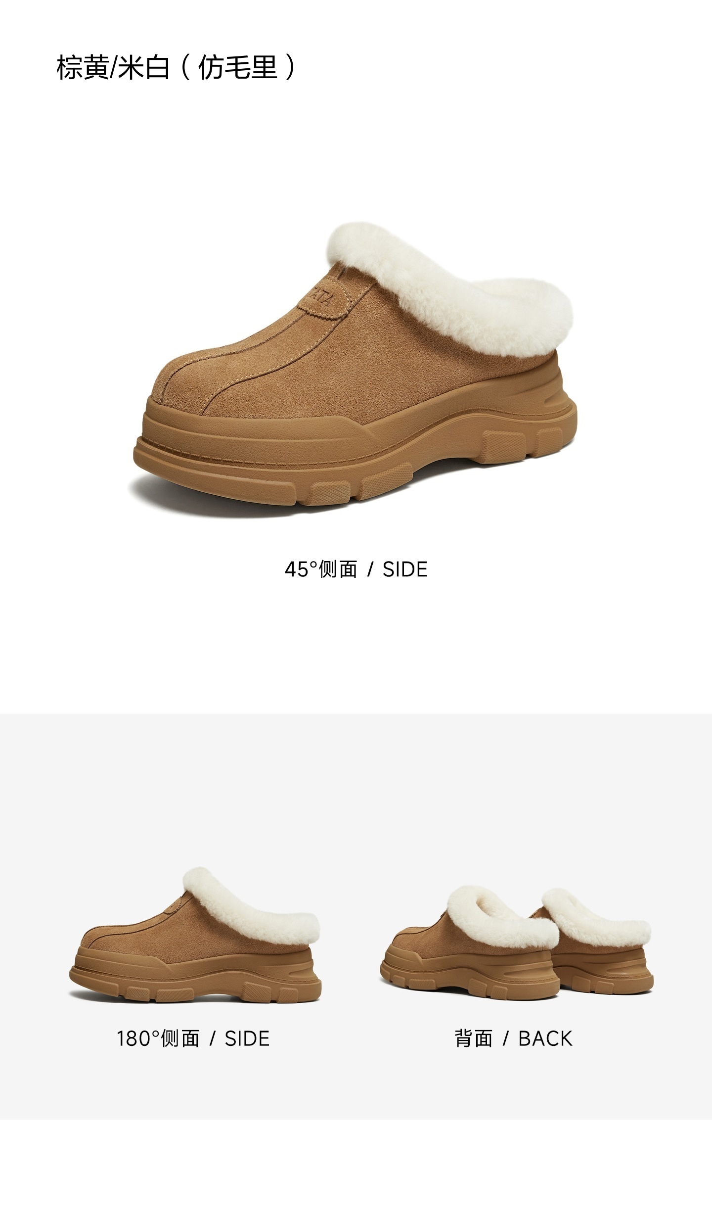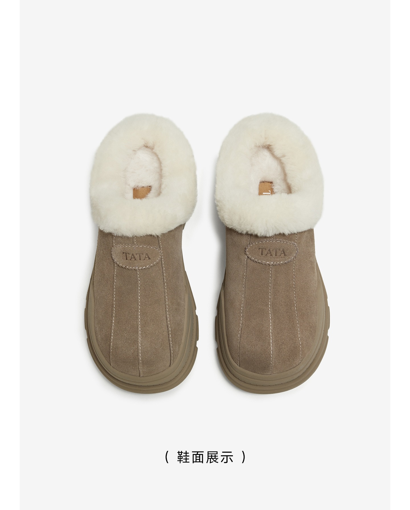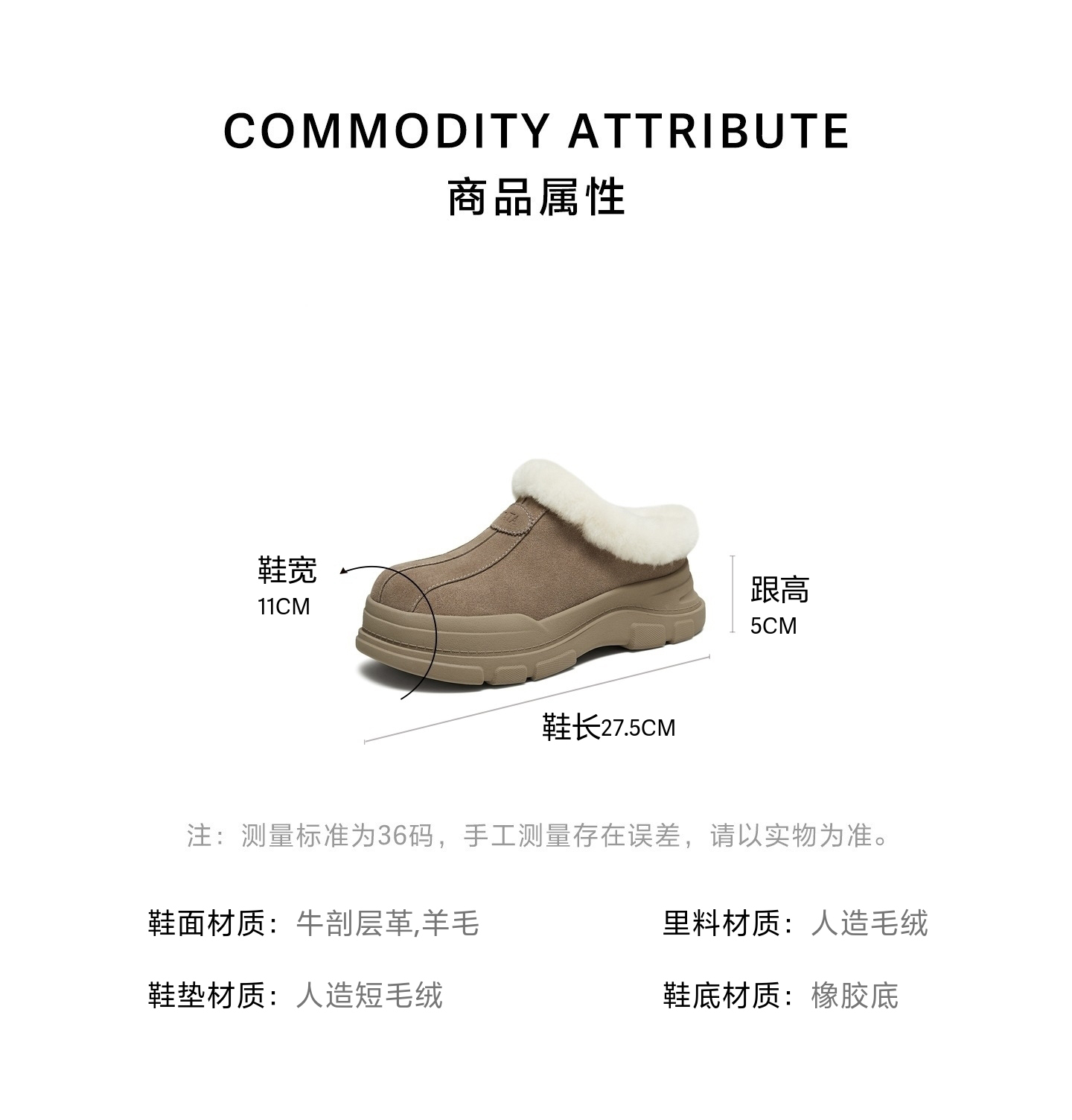 | 鞋头款式:圆头 | 鞋底材质:橡胶底 | 鞋面图案:纯色 | 鞋跟形状:厚底 | 鞋面材质:牛剖层革羊毛 |