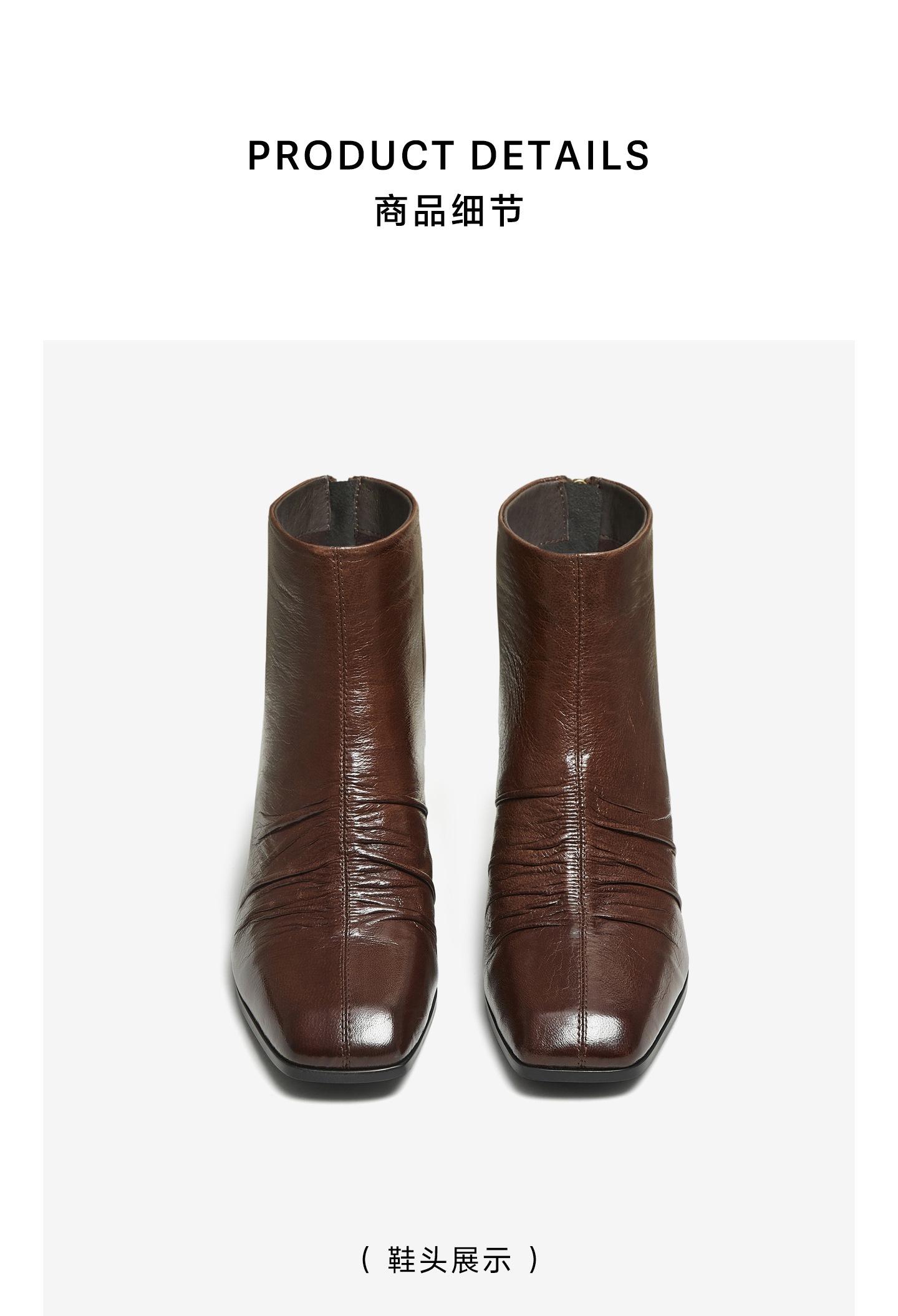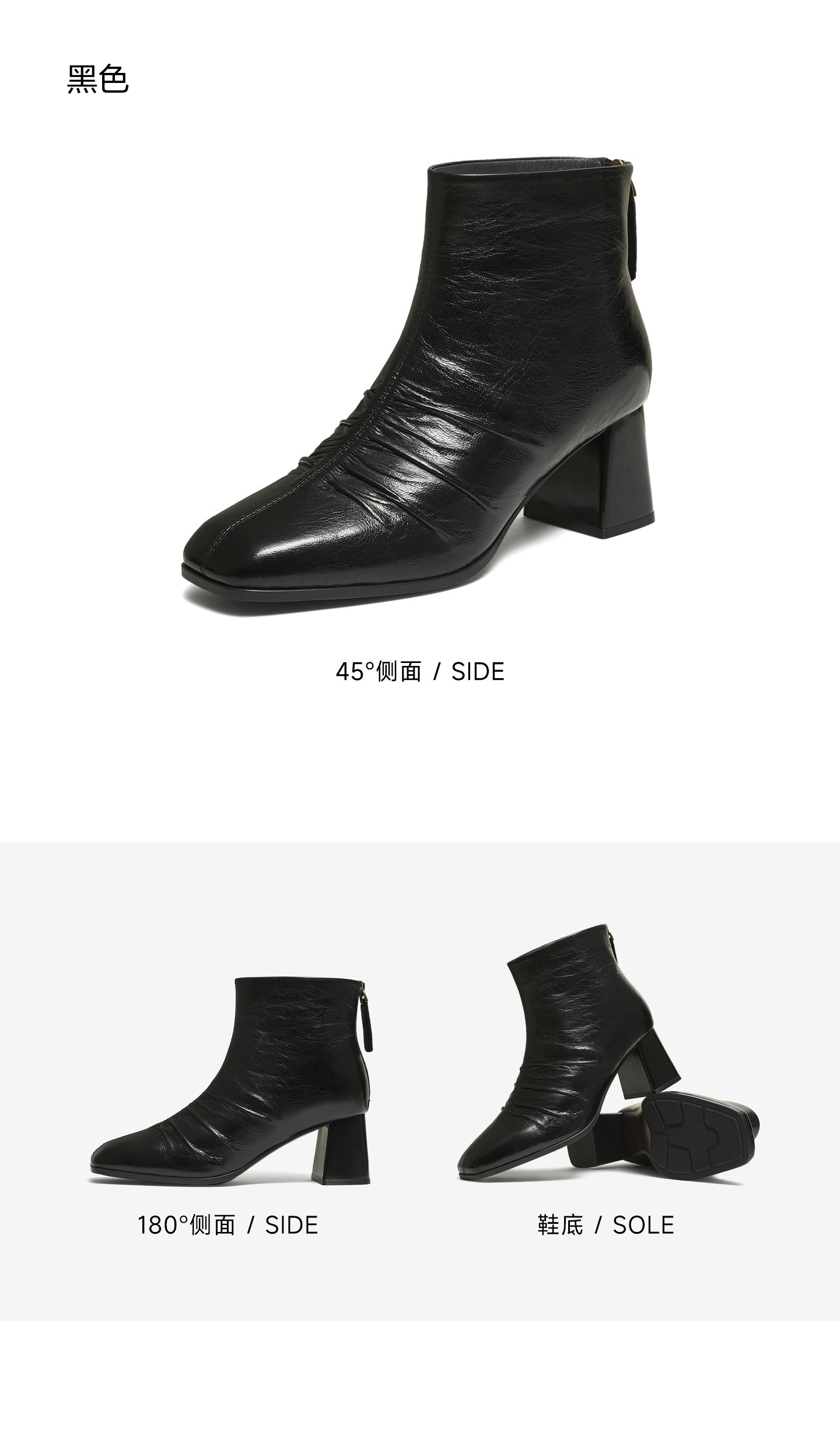 | 鞋底材质:橡胶底 | 靴筒内里材质:猪皮革织物面料 | 内增高:无 | 鞋面材质:羊皮革 | 闭合方式:后拉链 |