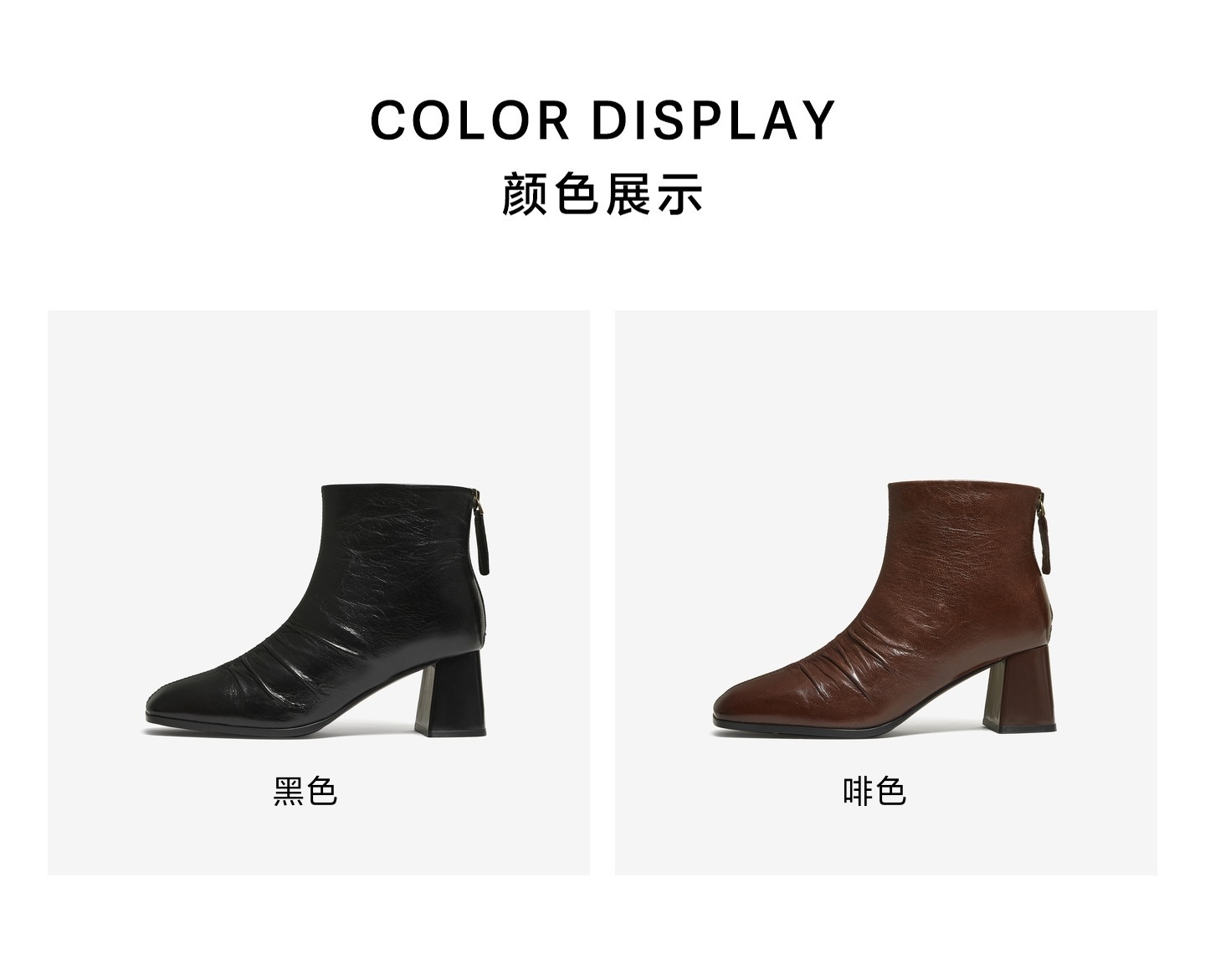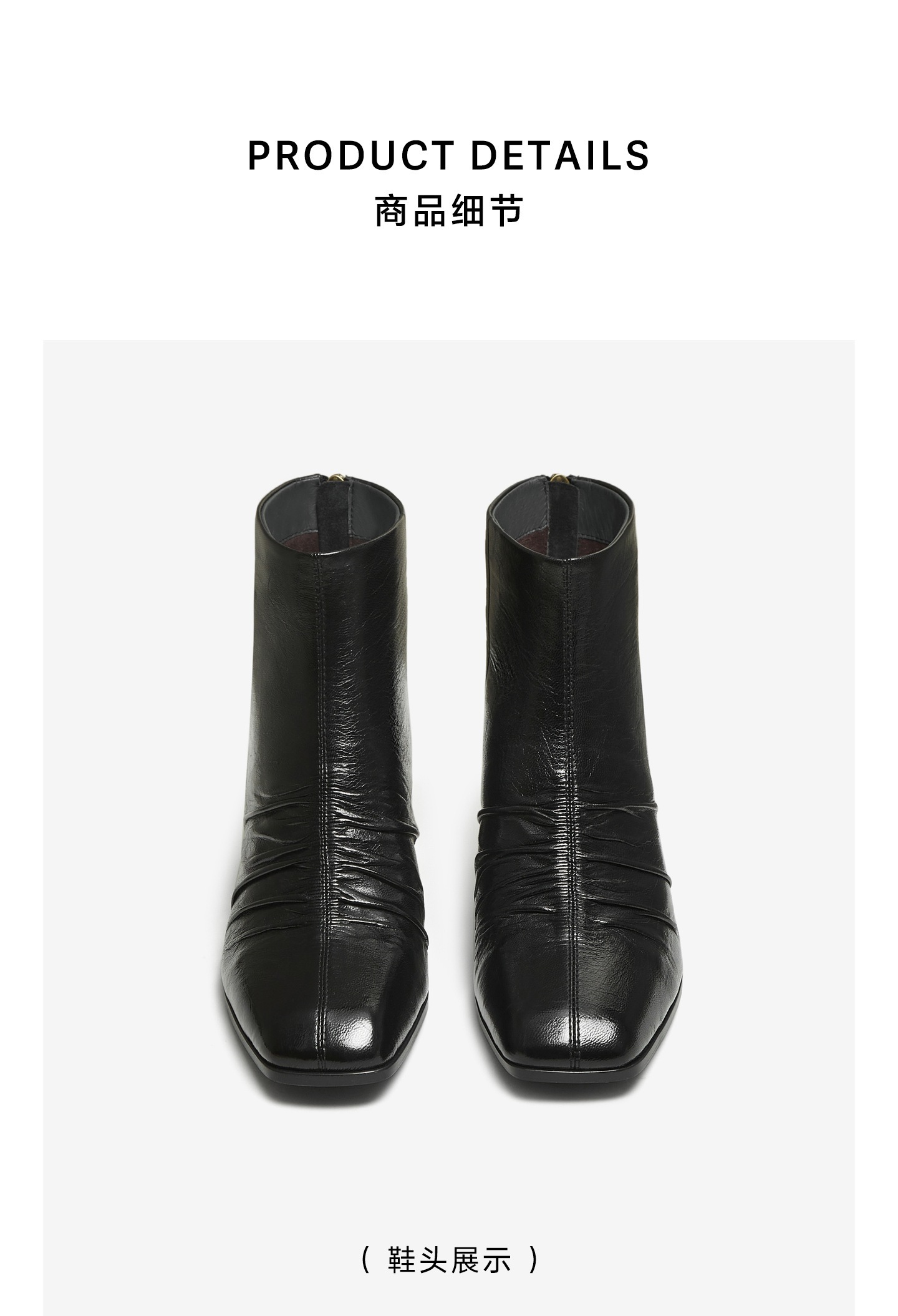 | 鞋底材质:橡胶底 | 靴筒内里材质:猪皮革织物面料 | 内增高:无 | 鞋面材质:羊皮革 | 闭合方式:后拉链 |