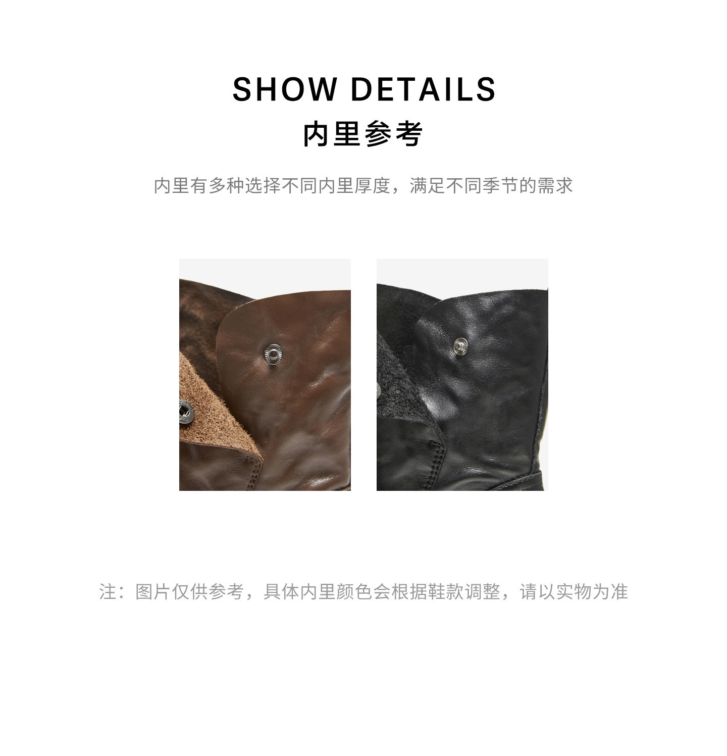 | 靴筒筒面材质:牛皮革 | 里料材质:织物面料猪皮革超纤 | 制鞋工艺:胶贴皮鞋 | 鞋垫材质:猪皮革 | 款式季节:冬季 |