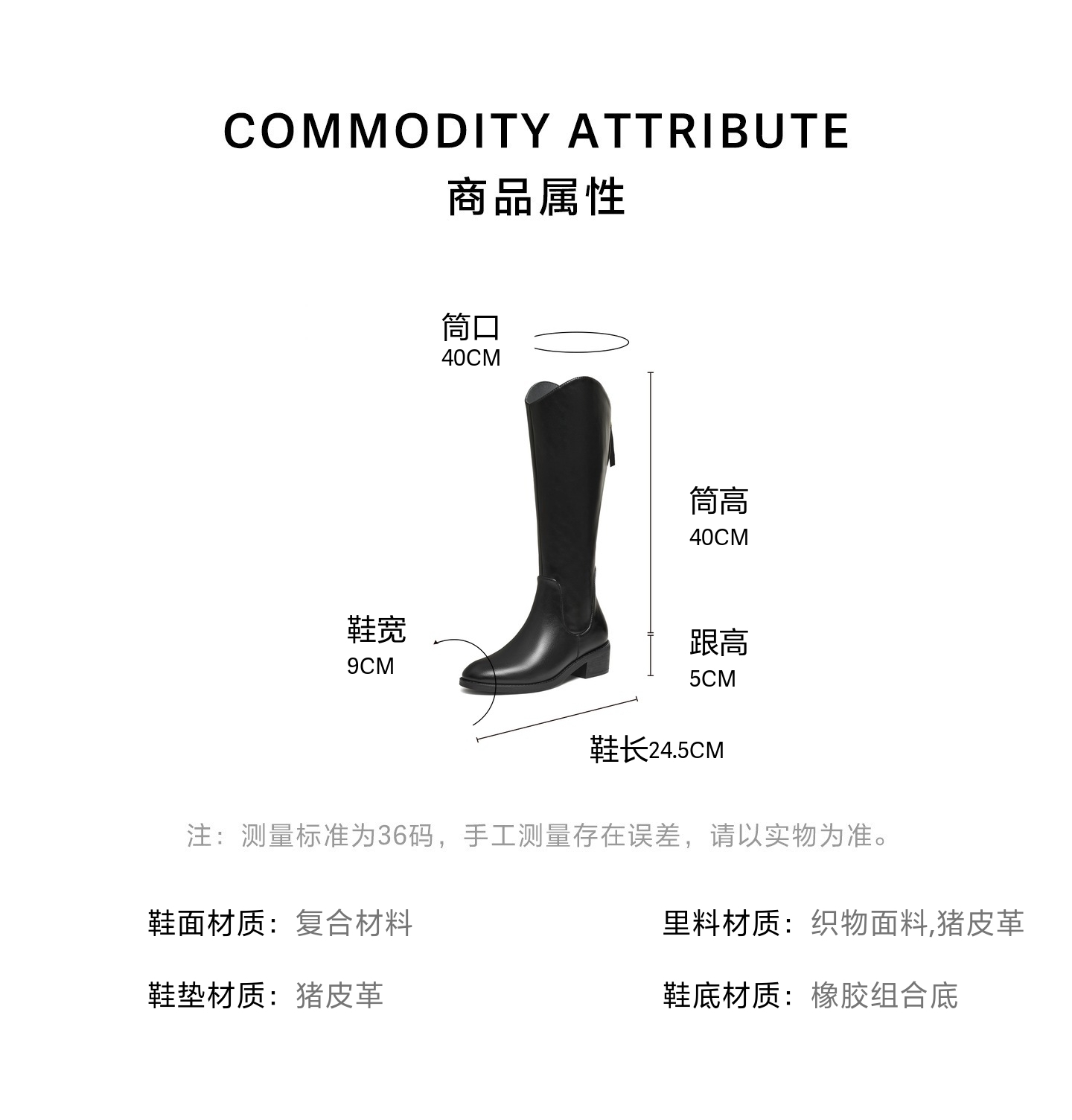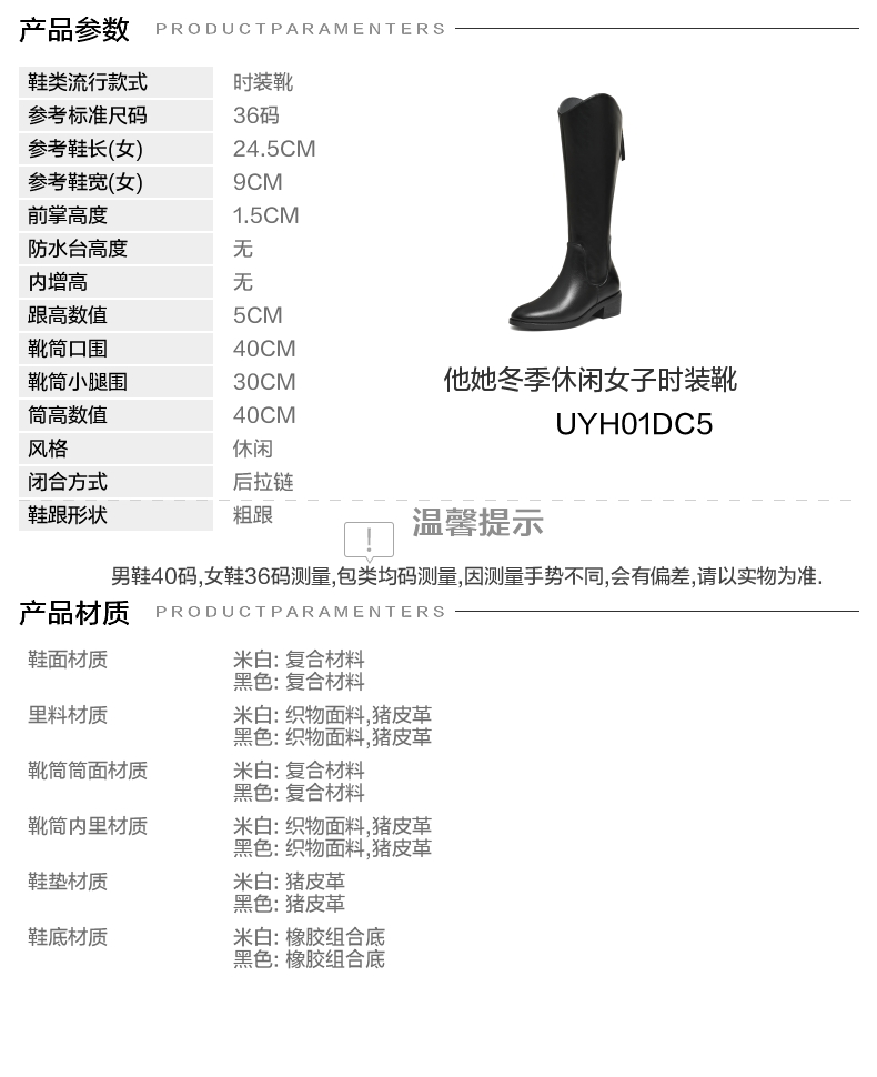 | 风格:休闲 | 色系:黑色 | 跟高数值:5CM | 性别:女子 | 筒高数值:40CM |