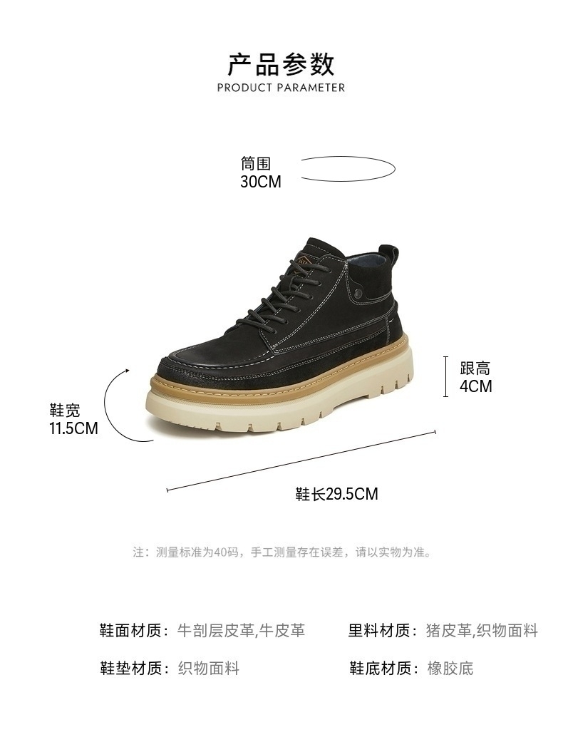 | 40码鞋长参考(男):29.5CM | 鞋底材质:橡胶底 | 靴筒内里材质:织物面料猪皮革 | 内增高:无 | 鞋面材质:牛剖层皮革牛皮革 |
