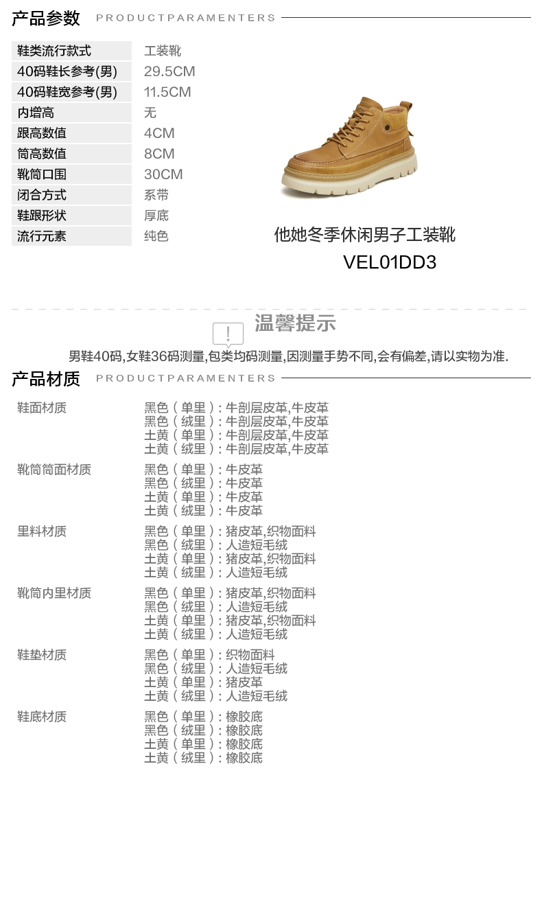 | 闭合方式:系带 | 40码鞋宽参考(男):11.5CM | 靴筒口围:30CM | 上市时间:2024年冬季 | 鞋类流行款式:工装靴 |