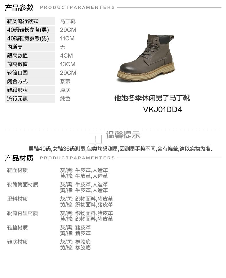 | 闭合方式:系带 | 40码鞋宽参考(男):11CM | 靴筒口围:29CM | 上市时间:2024年冬季 | 鞋类流行款式:马丁靴 |