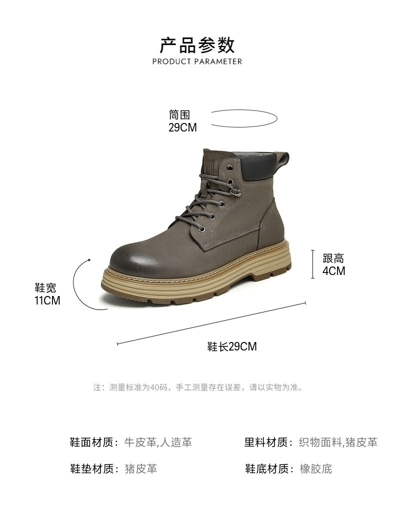 | 40码鞋长参考(男):29CM | 鞋底材质:橡胶底 | 靴筒内里材质:织物面料猪皮革 | 内增高:无 | 鞋面材质:人造革牛皮革 |