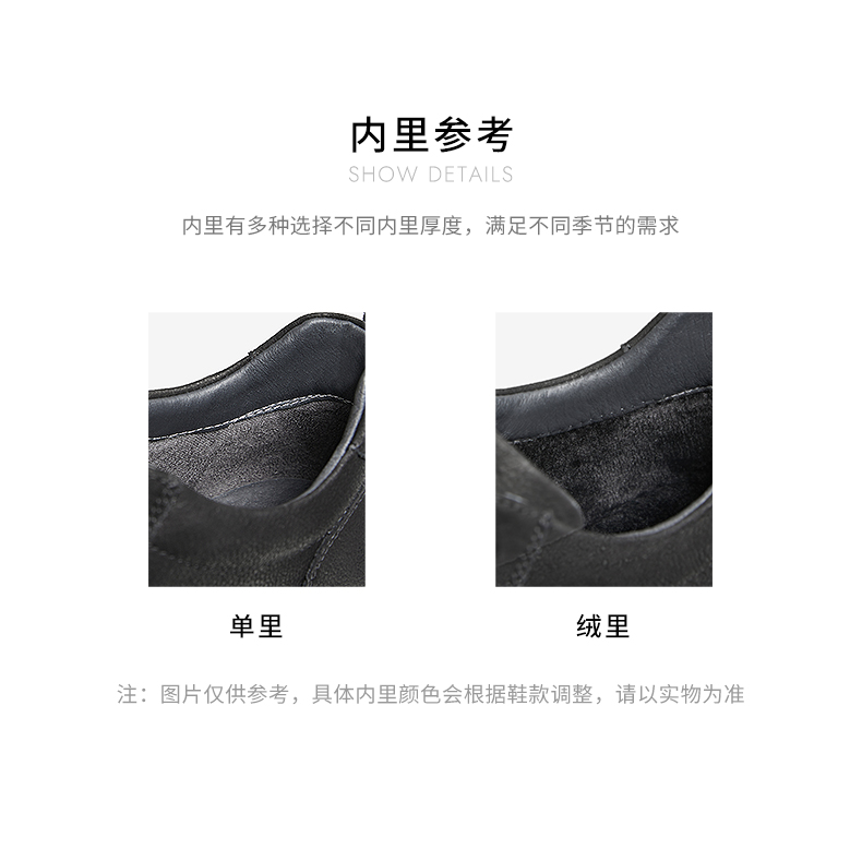 | 制鞋工艺:胶贴皮鞋 | 款式季节:冬季 | 鞋垫材质:猪皮革 | 渠道划分:线下同步 | 皮质特征:软面皮 |