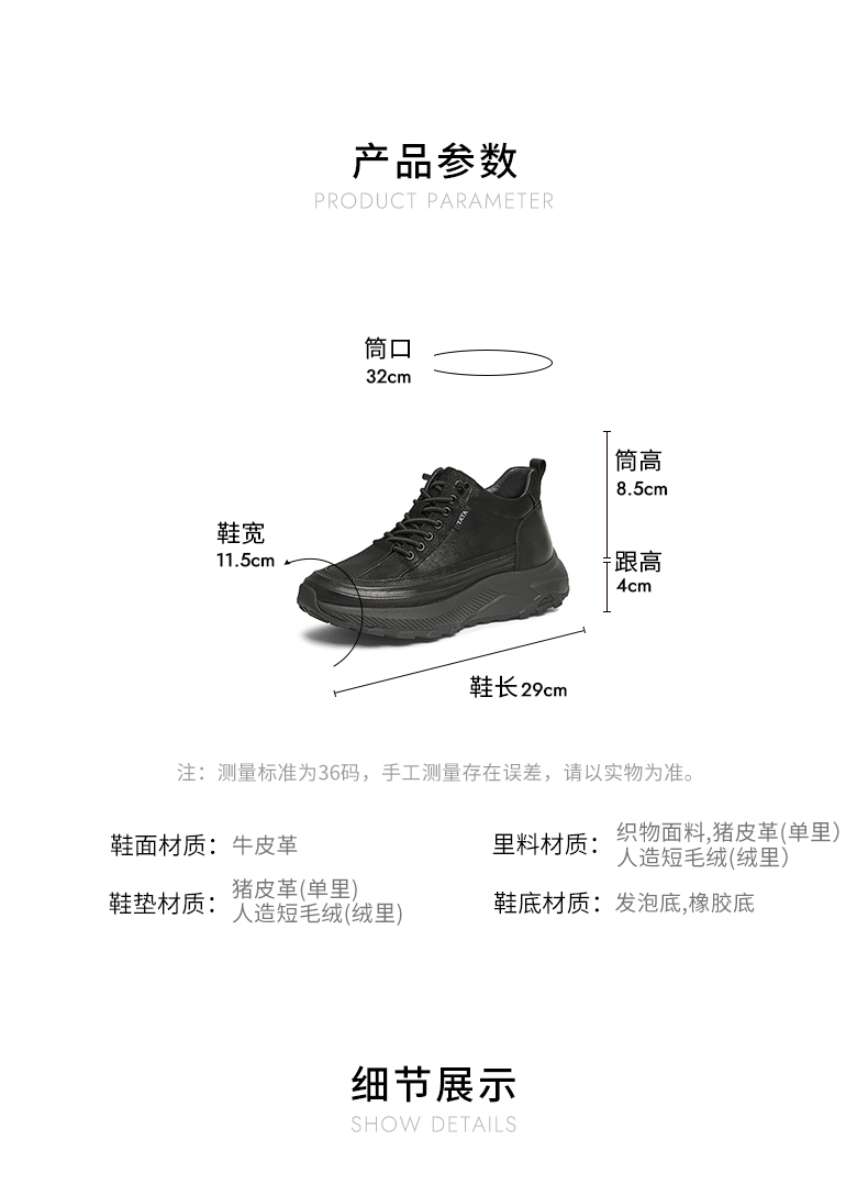 | 40码鞋长参考(男):29CM | 鞋底材质:橡胶底发泡底 | 靴筒内里材质:猪皮革织物面料 | 内增高:无 | 鞋面材质:牛皮革 |