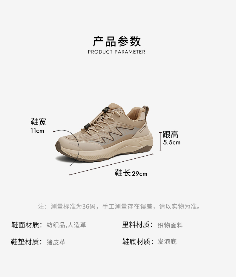 | 执行标准:舒适运动鞋Q/LR002-2023 | 跟高范围:中跟鞋(3-5CM) | 鞋面图案:纯色 | 鞋跟形状:厚底 | 厂家地址:广东省深圳市 |