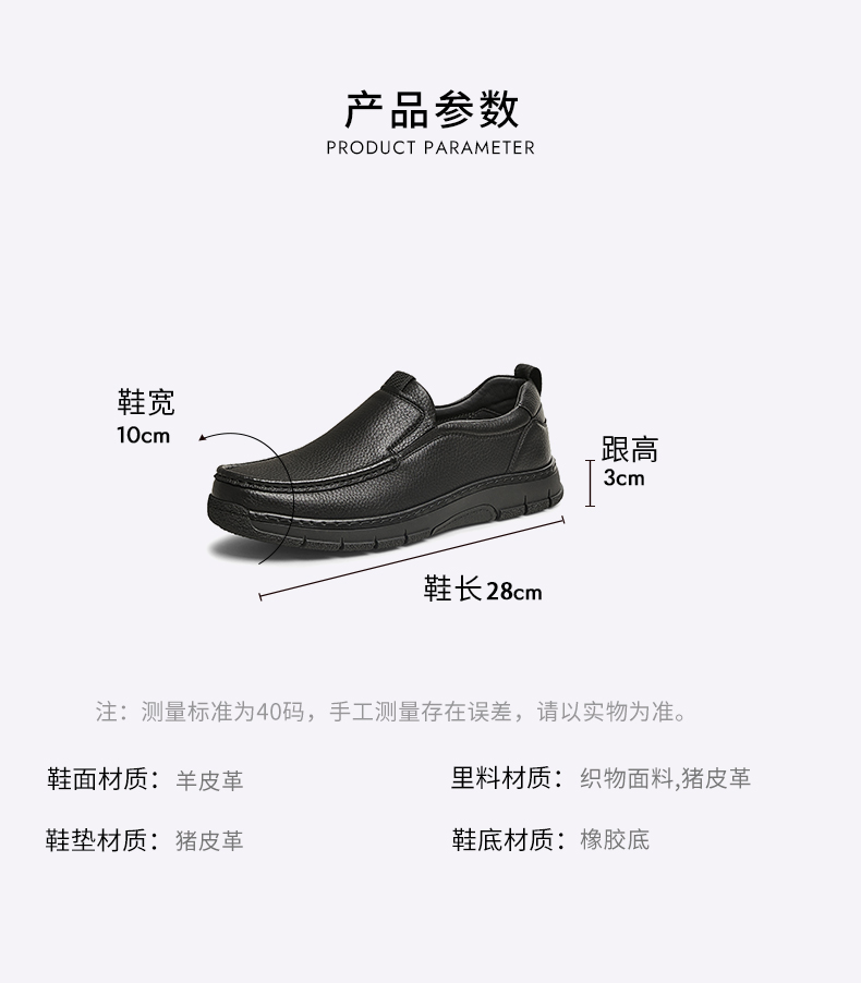 | 40码鞋长参考(男):28CM | 鞋帮:低帮 | 鞋底材质:橡胶底 | 内增高:无 | 鞋面材质:羊皮革 |