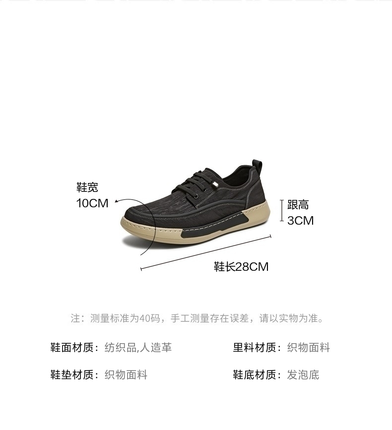 | 风格:休闲 | 色系:黑色 | 跟高数值:3CM | 40码鞋宽参考(男):10CM | 性别:男子 |