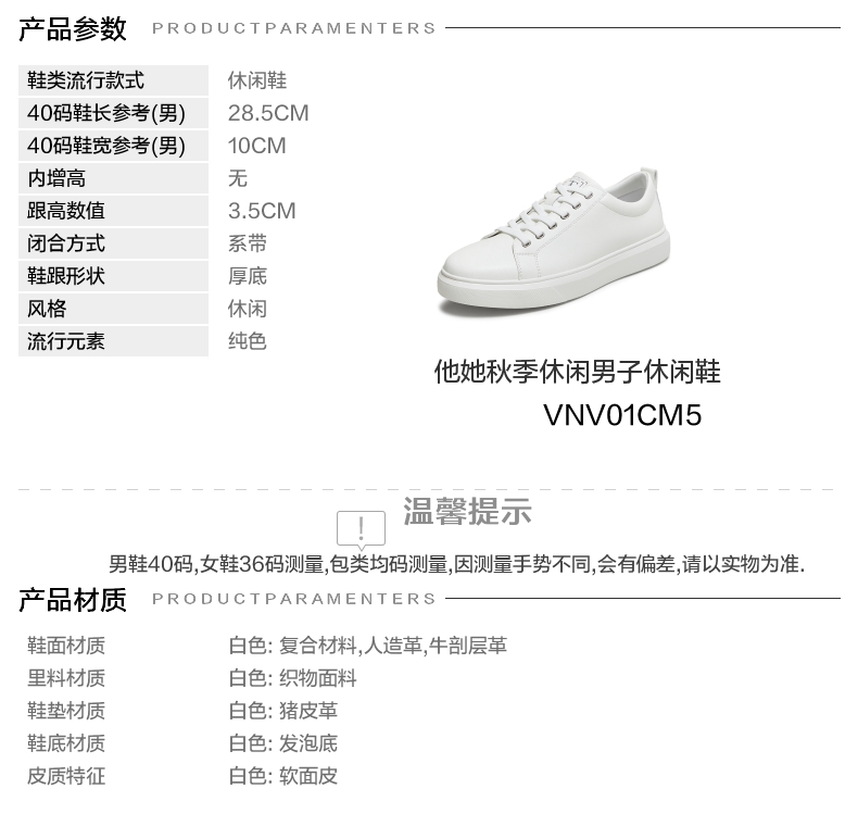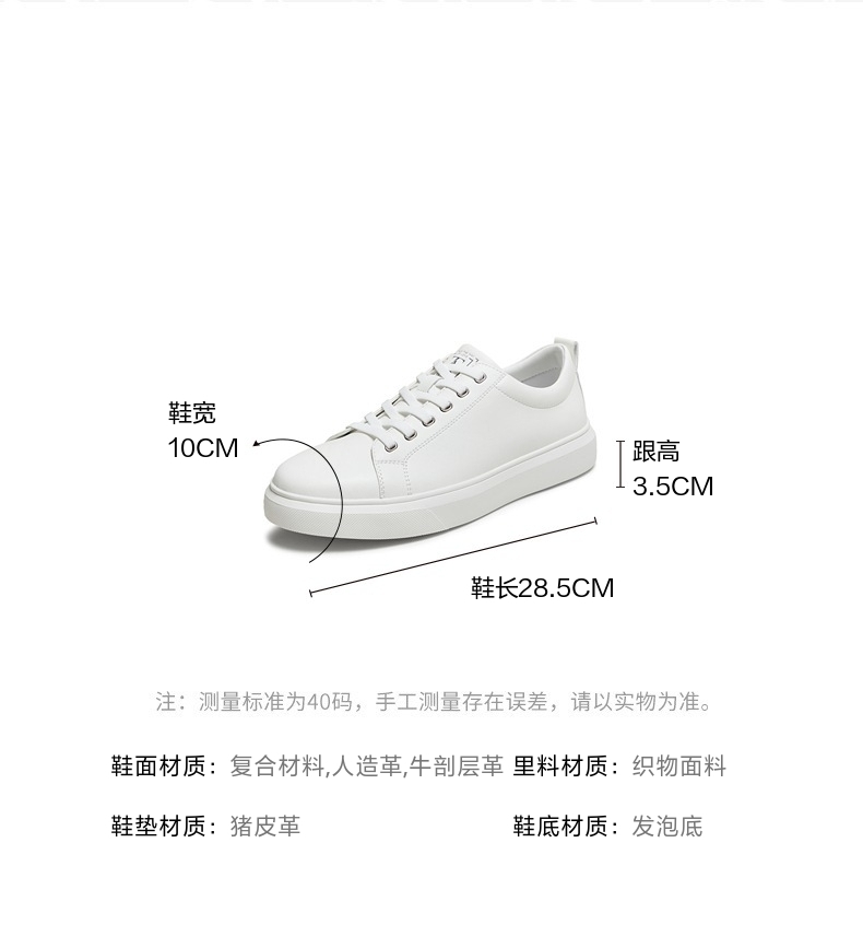 | 风格:休闲 | 色系:白色 | 跟高数值:3.5CM | 40码鞋宽参考(男):10CM | 性别:男子 |