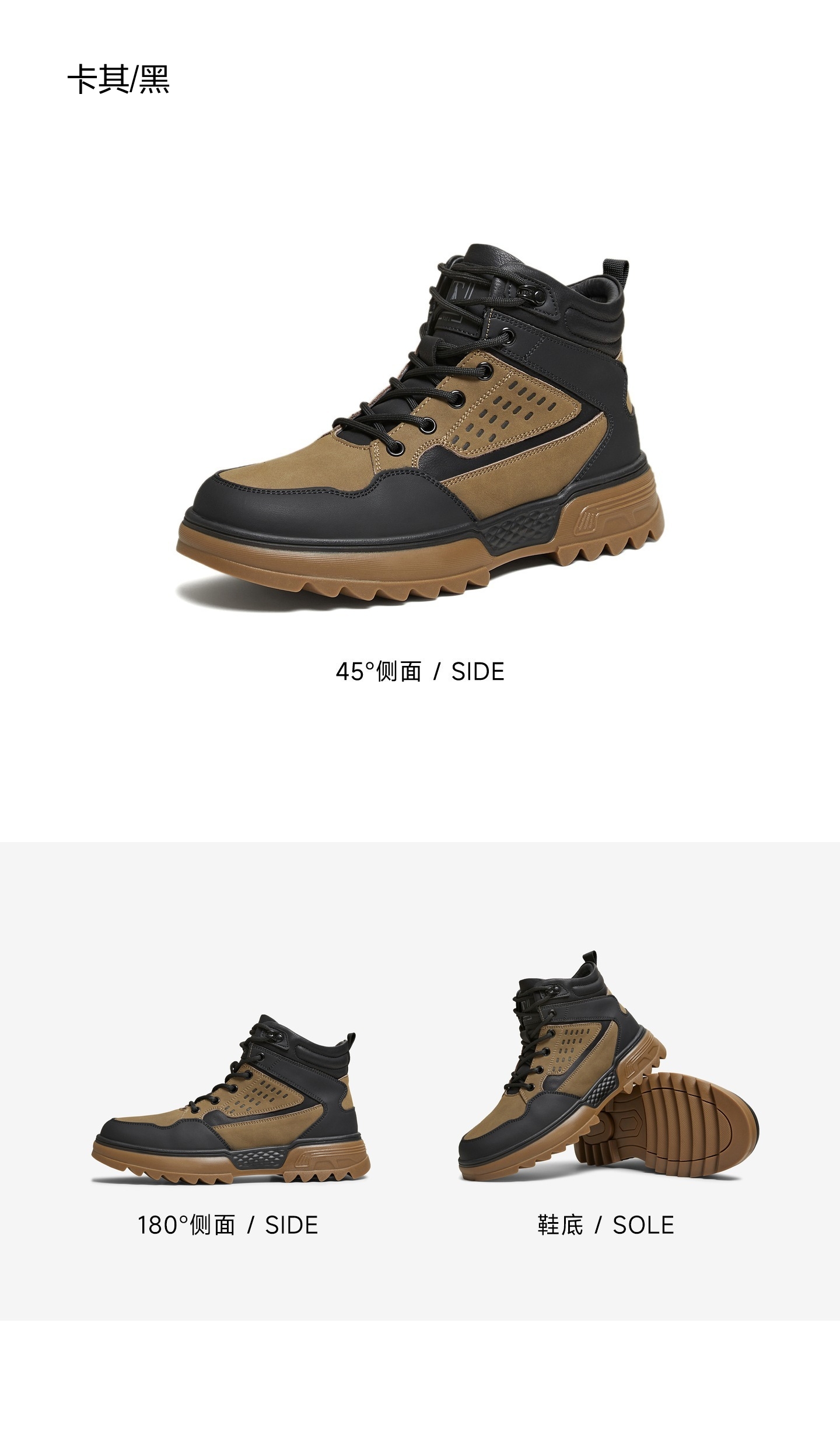 | 鞋面内里材质:猪皮革 | 跟高数值:3CM | 色系:卡其 | 性别:男子 | 筒高数值:16.5CM |