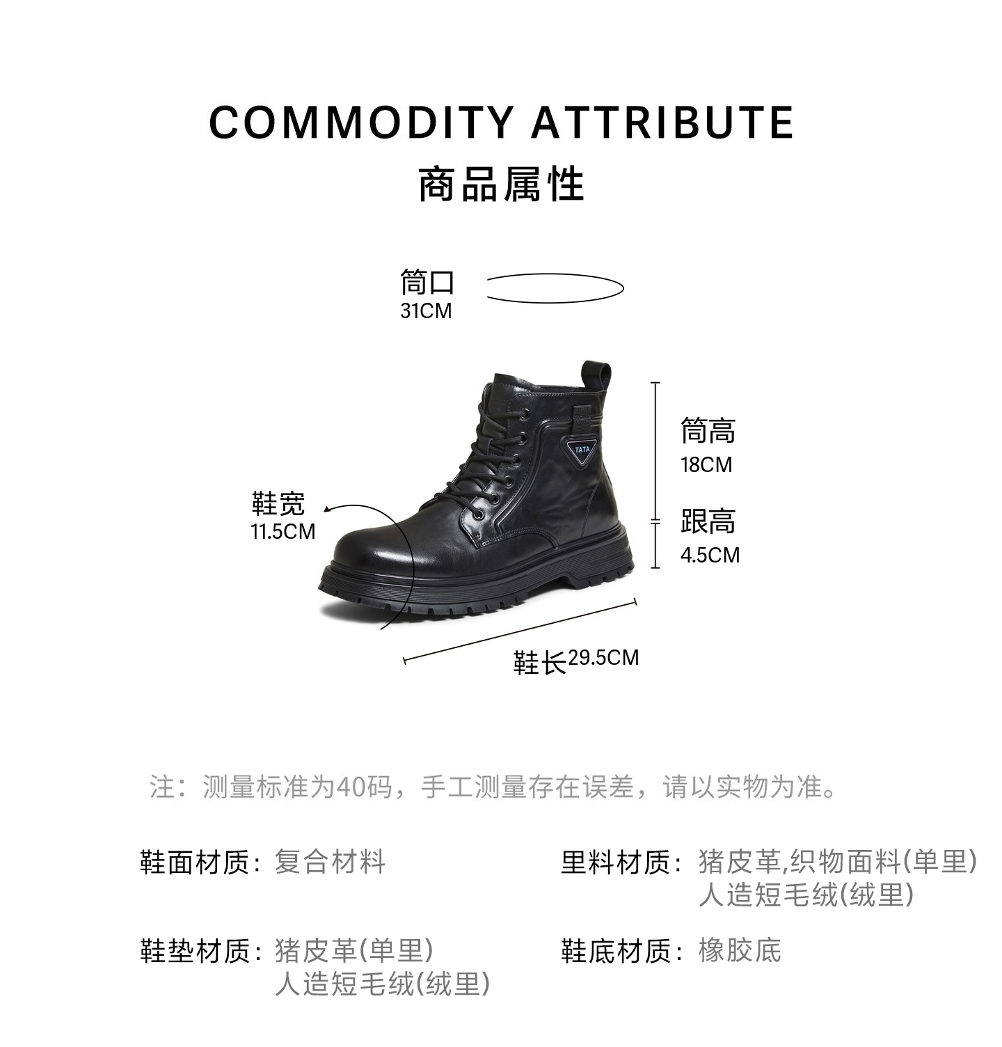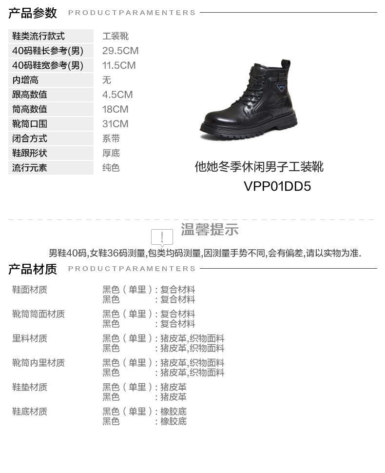 | 闭合方式:系带 | 40码鞋宽参考(男):11.5CM | 靴筒口围:31CM | 上市时间:2025年冬季 | 鞋类流行款式:工装靴 |