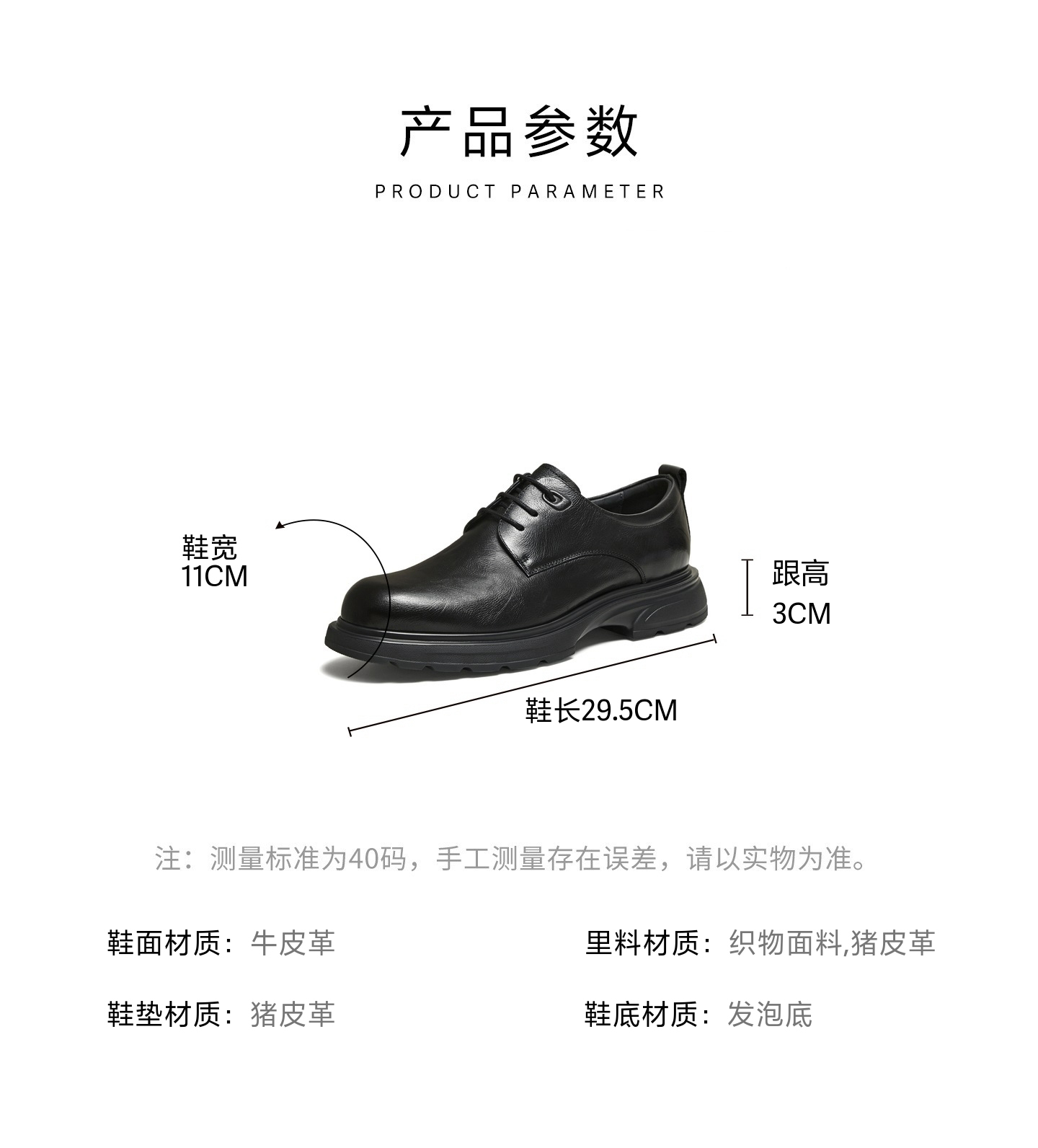 | 风格:休闲 | 色系:黑色 | 跟高数值:3CM | 40码鞋宽参考(男):11CM | 性别:男子 |