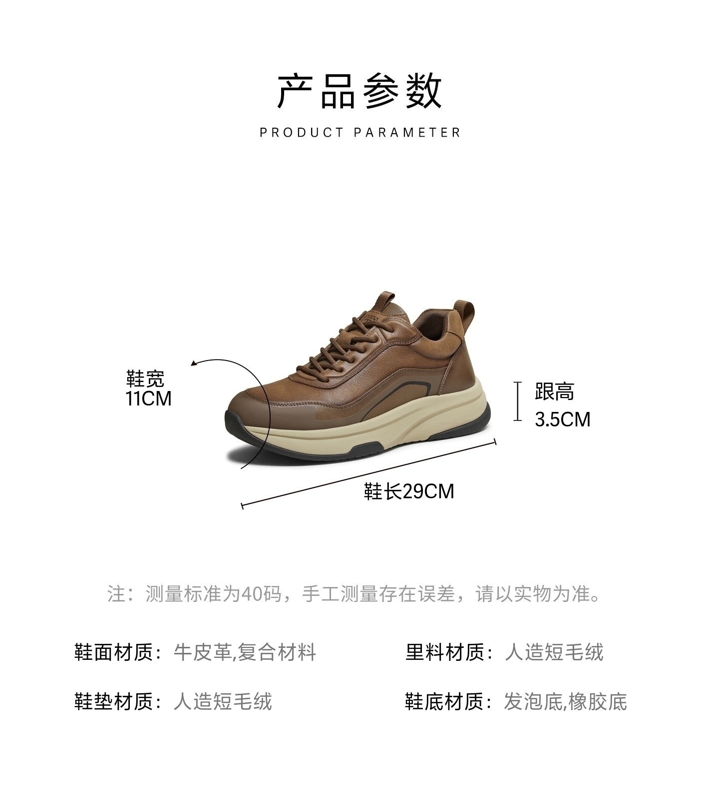 | 风格:休闲 | 色系:咖啡色 | 跟高数值:3.5CM | 40码鞋宽参考(男):11CM | 性别:男子 |