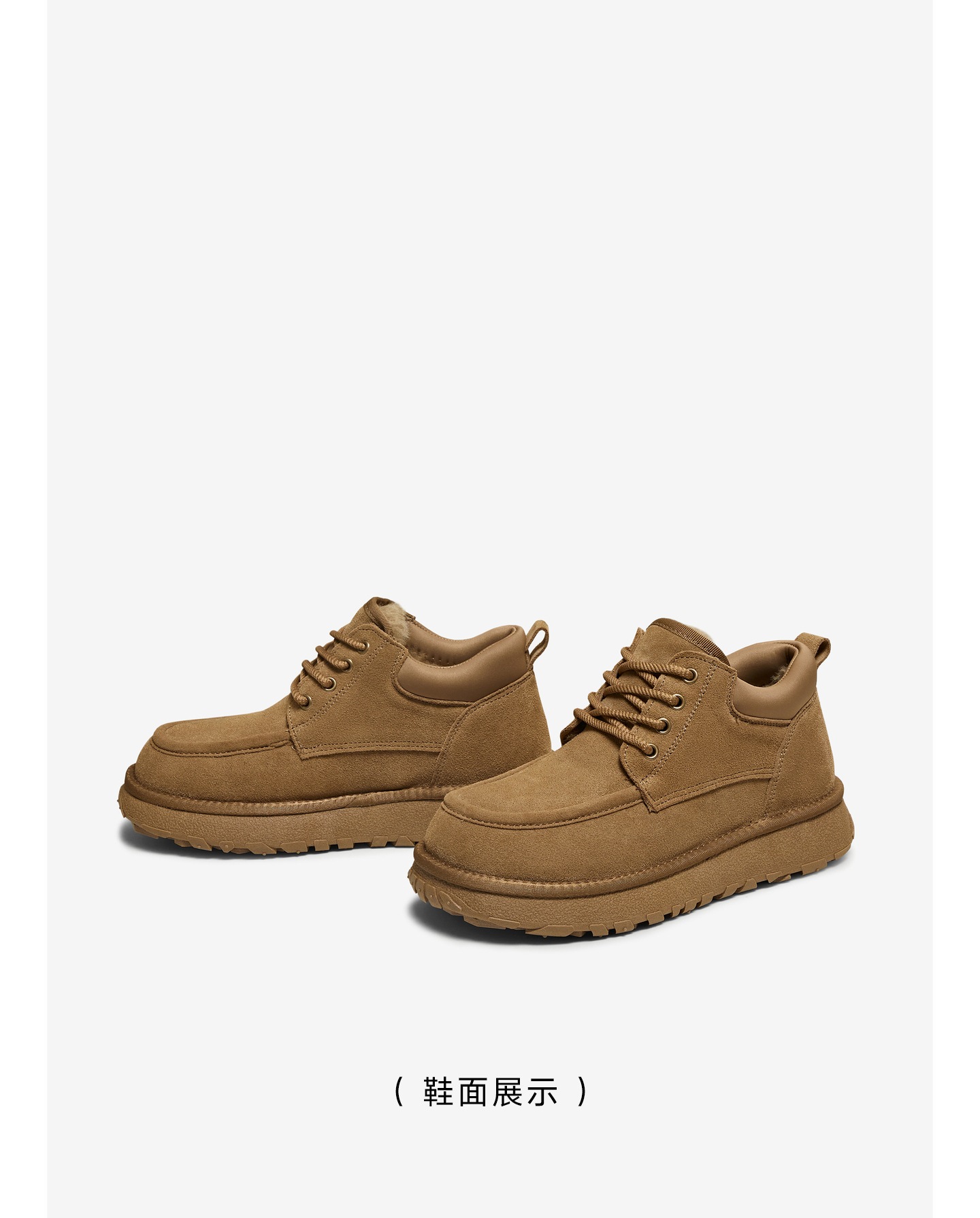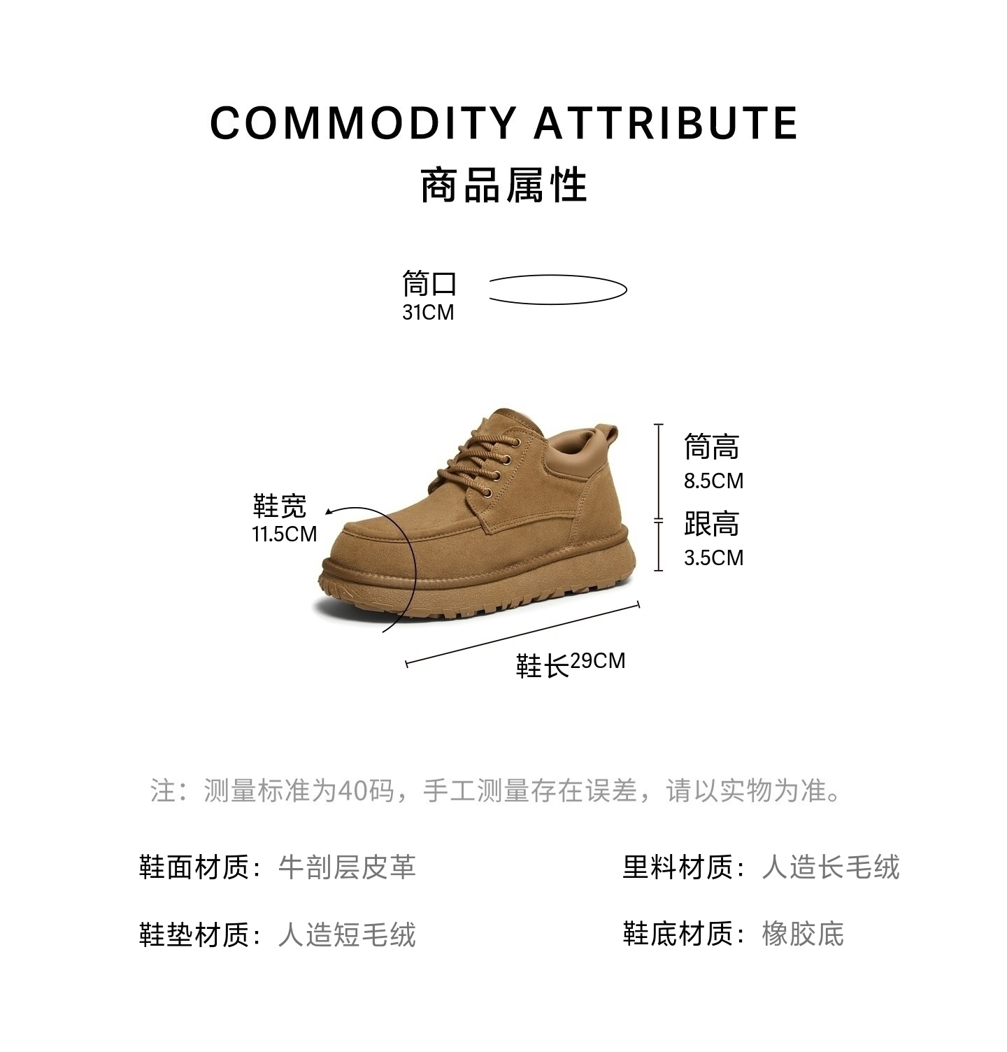 | 40码鞋长参考(男):29CM | 鞋底材质:橡胶底 | 靴筒内里材质:人造长毛绒 | 内增高:无 | 鞋面材质:牛剖层皮革 |