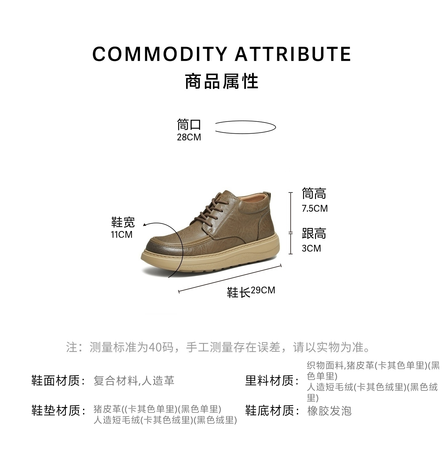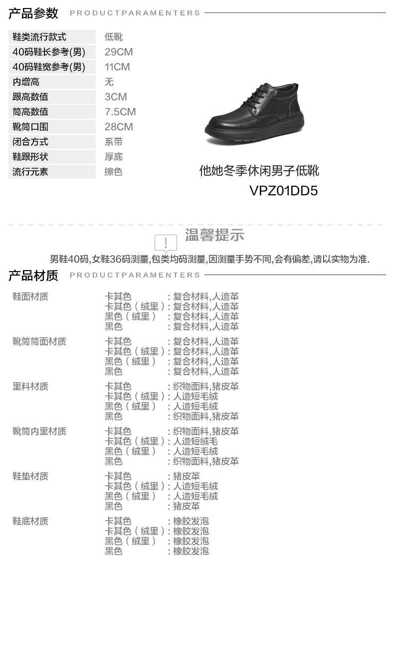 | 闭合方式:系带 | 40码鞋宽参考(男):11CM | 靴筒口围:28CM | 上市时间:2025年冬季 | 鞋类流行款式:低靴 |