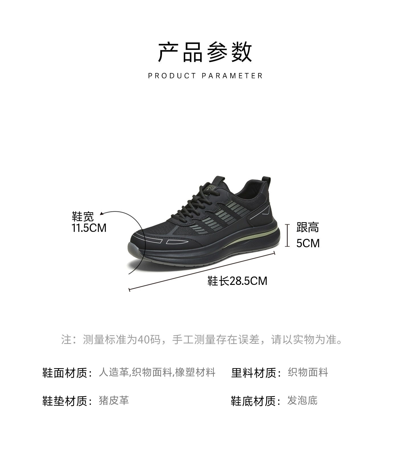 | 风格:休闲 | 色系:黑色 | 跟高数值:5CM | 40码鞋宽参考(男):11.5CM | 性别:男子 |