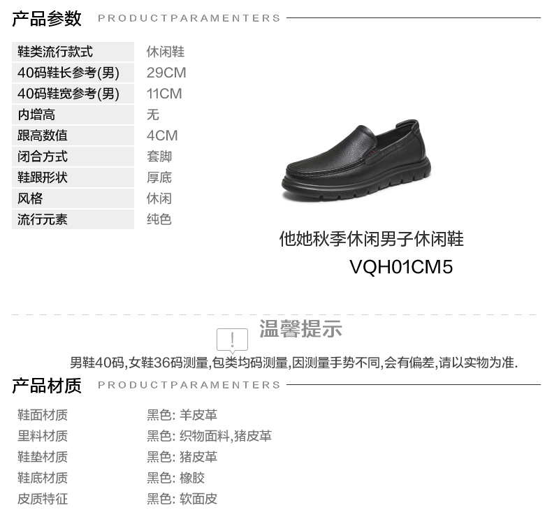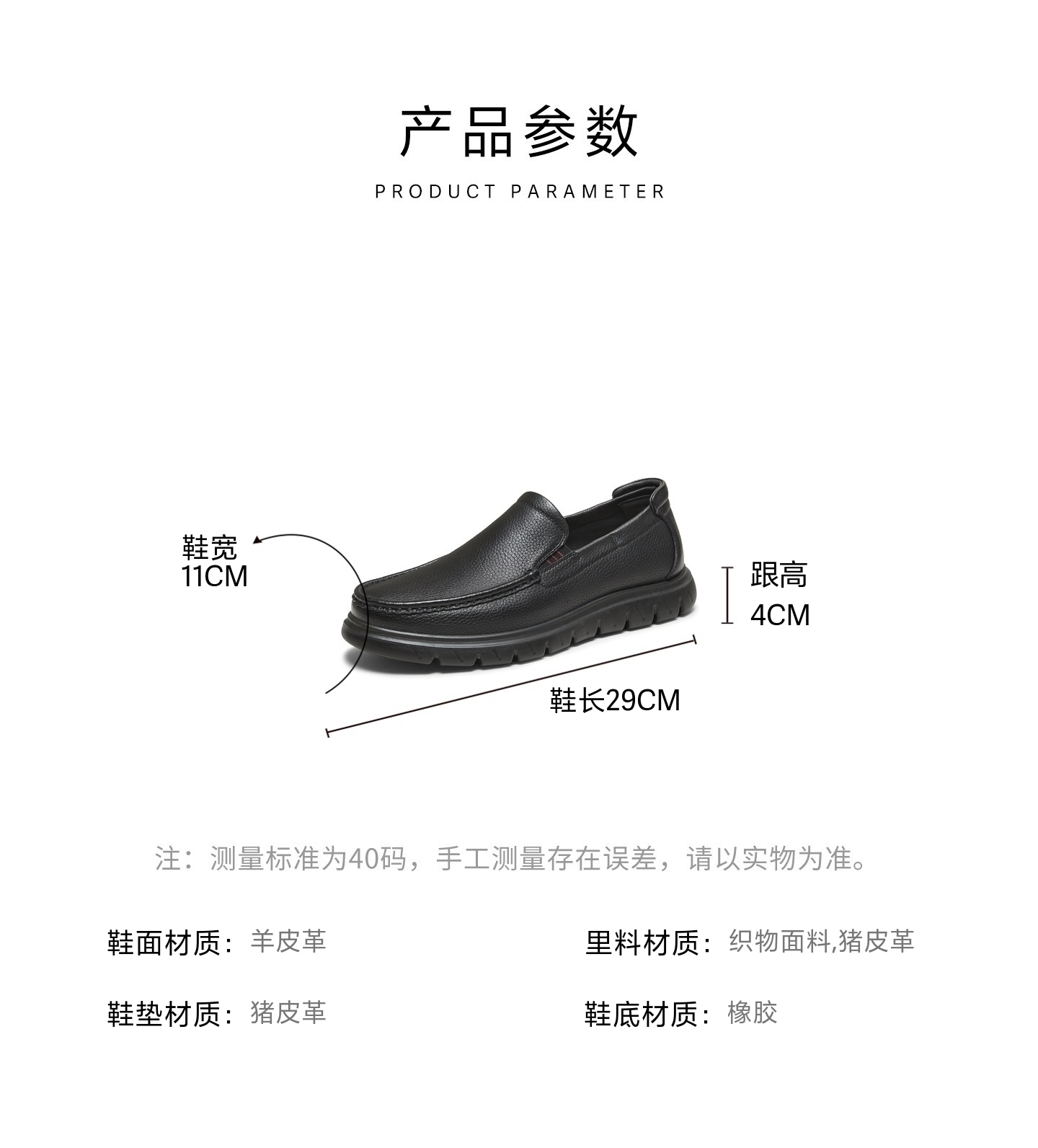 | 风格:休闲 | 色系:黑色 | 跟高数值:4CM | 40码鞋宽参考(男):11CM | 性别:男子 |