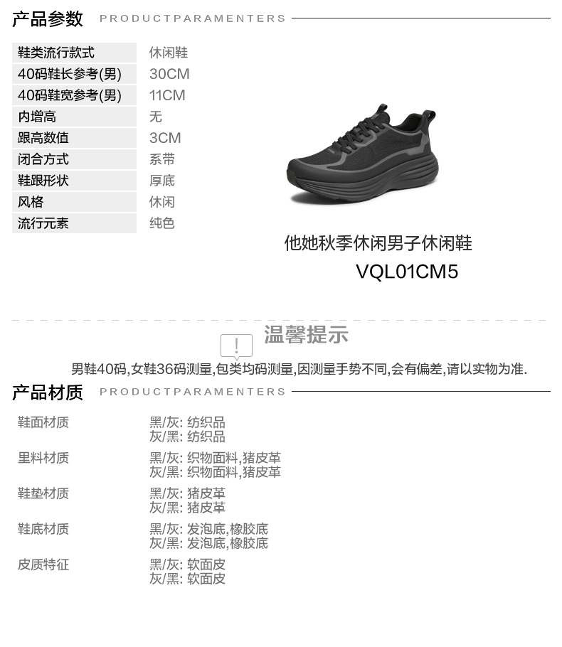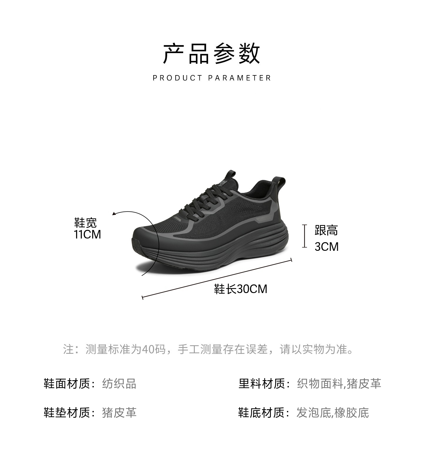 | 风格:休闲 | 色系:黑色 | 跟高数值:3CM | 40码鞋宽参考(男):11CM | 性别:男子 |