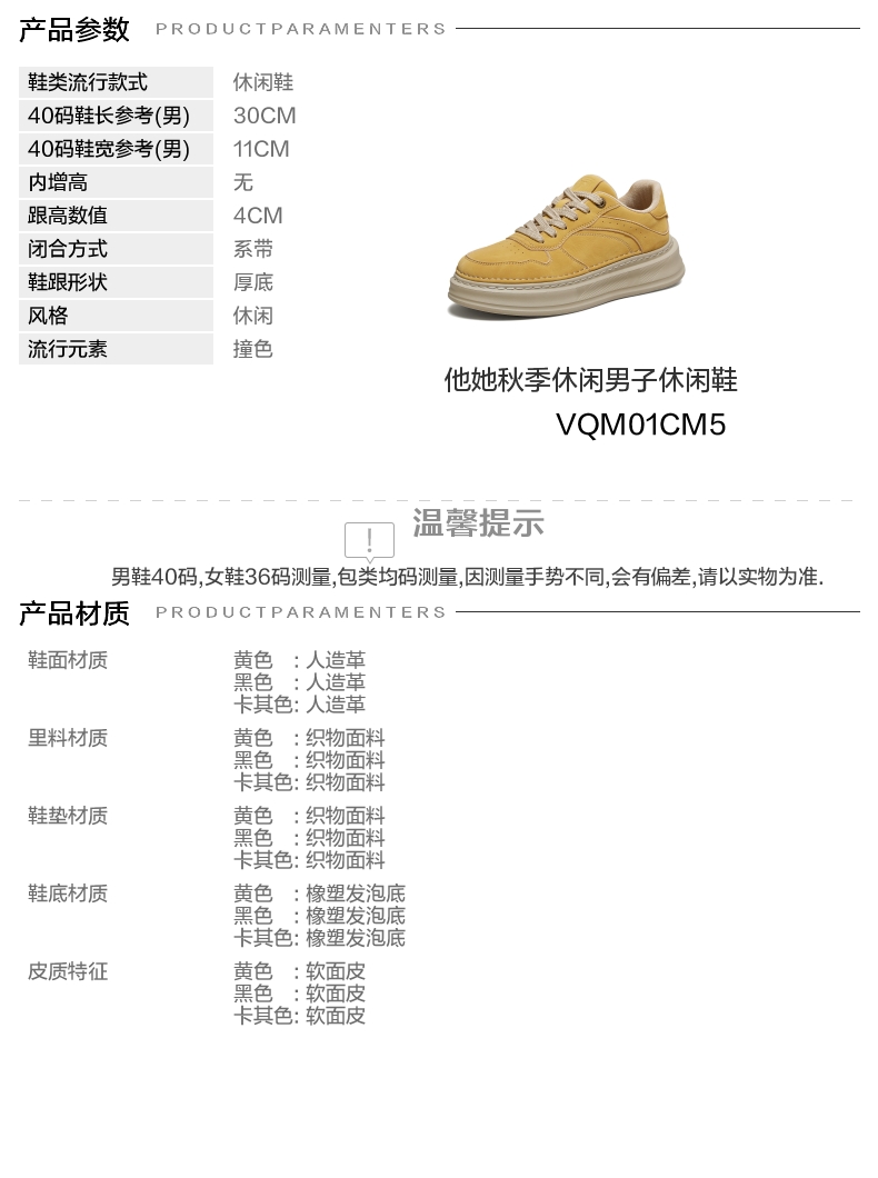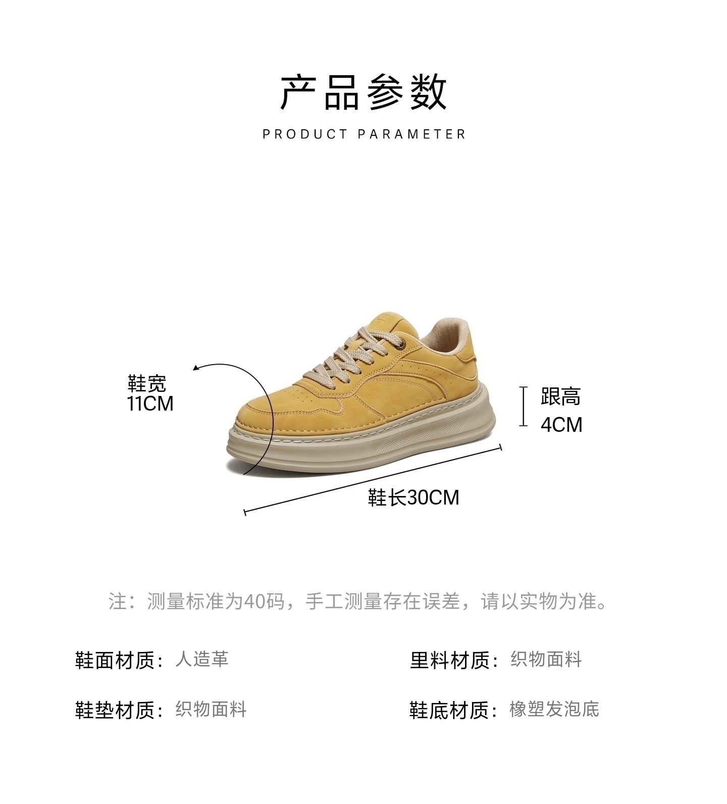 | 风格:休闲 | 色系:黄色 | 跟高数值:4CM | 40码鞋宽参考(男):11CM | 性别:男子 |