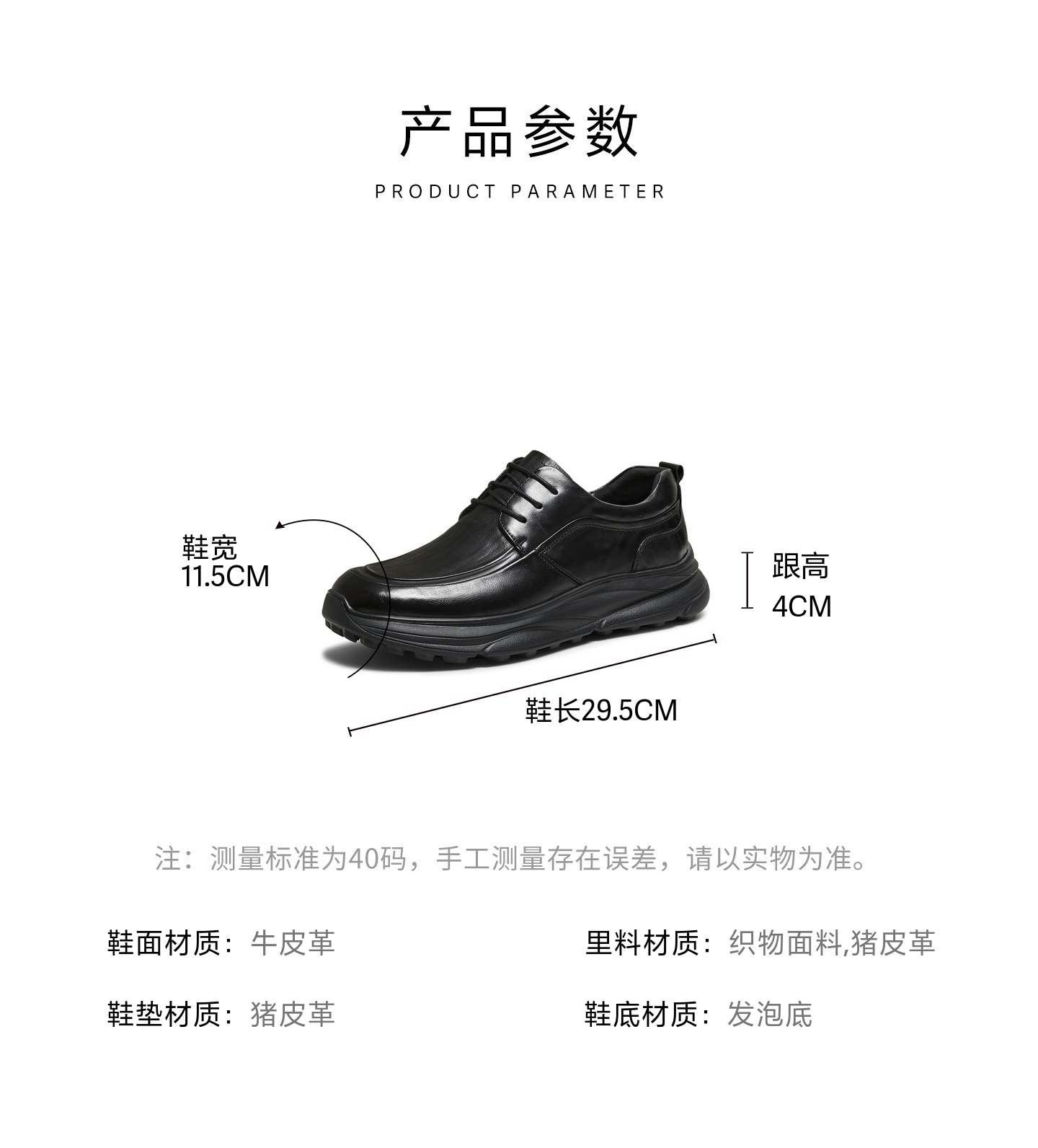 | 风格:休闲 | 色系:黑色 | 跟高数值:4CM | 40码鞋宽参考(男):11.5CM | 性别:男子 |