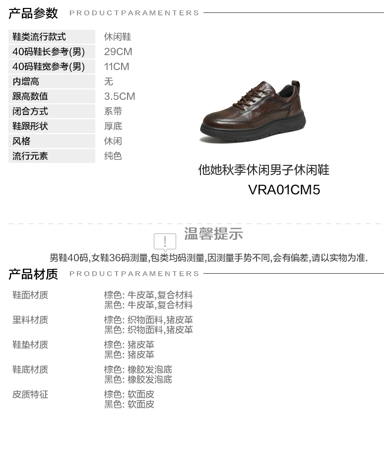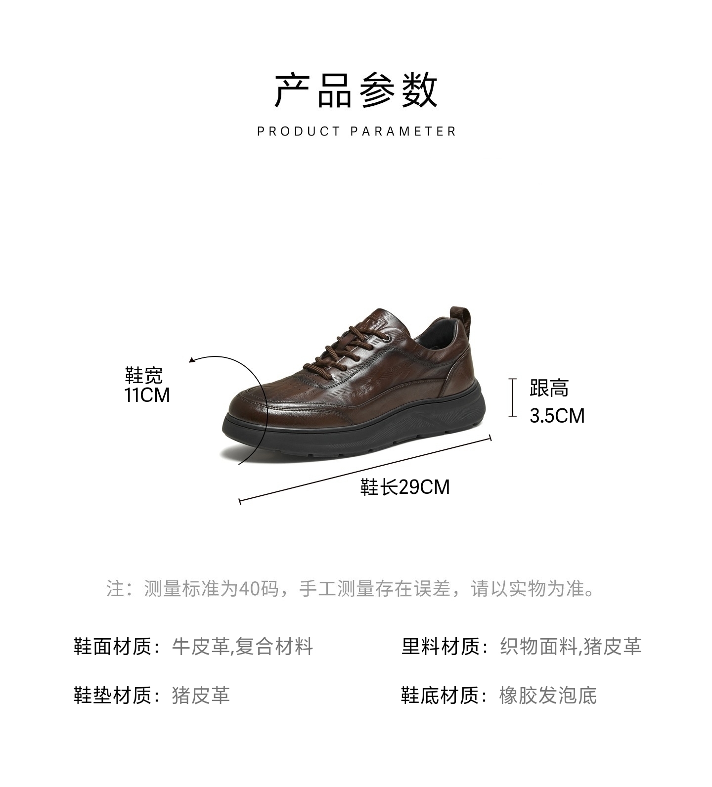 | 风格:休闲 | 色系:棕色 | 跟高数值:3.5CM | 40码鞋宽参考(男):11CM | 性别:男子 |