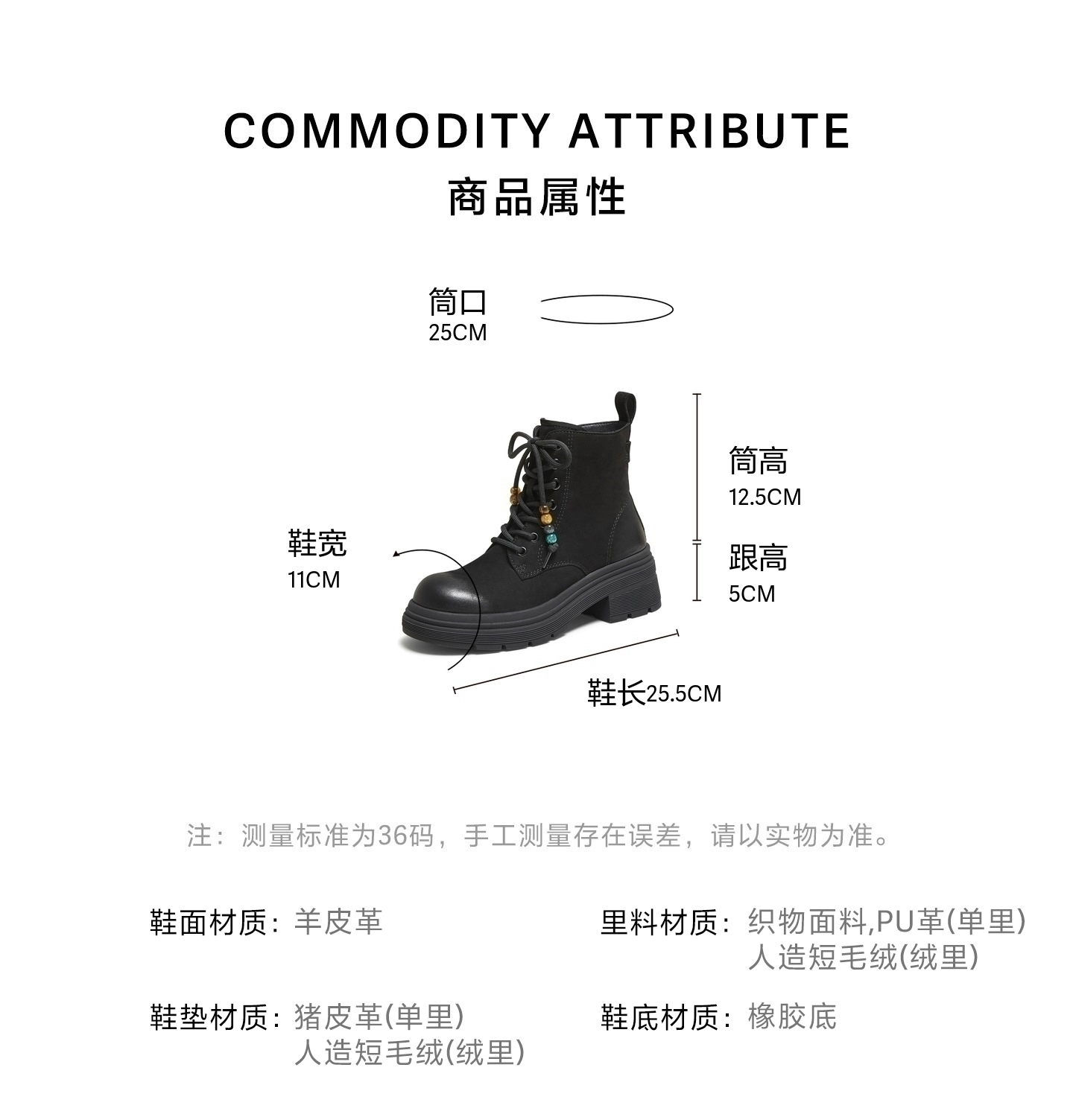 | 参考鞋宽(女):11CM | 风格:休闲 | 色系:黑色 | 跟高数值:5CM | 筒高数值:12.5CM |