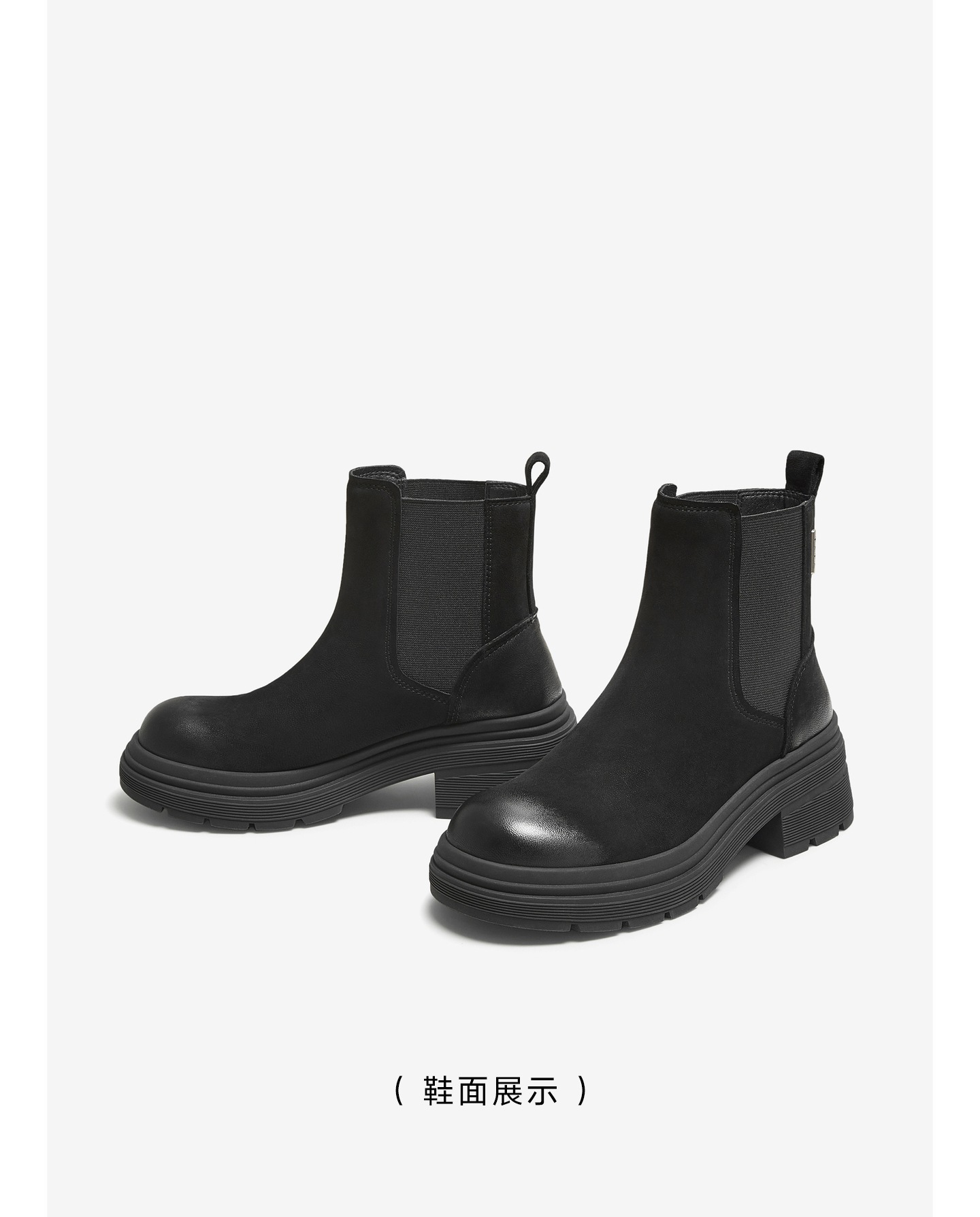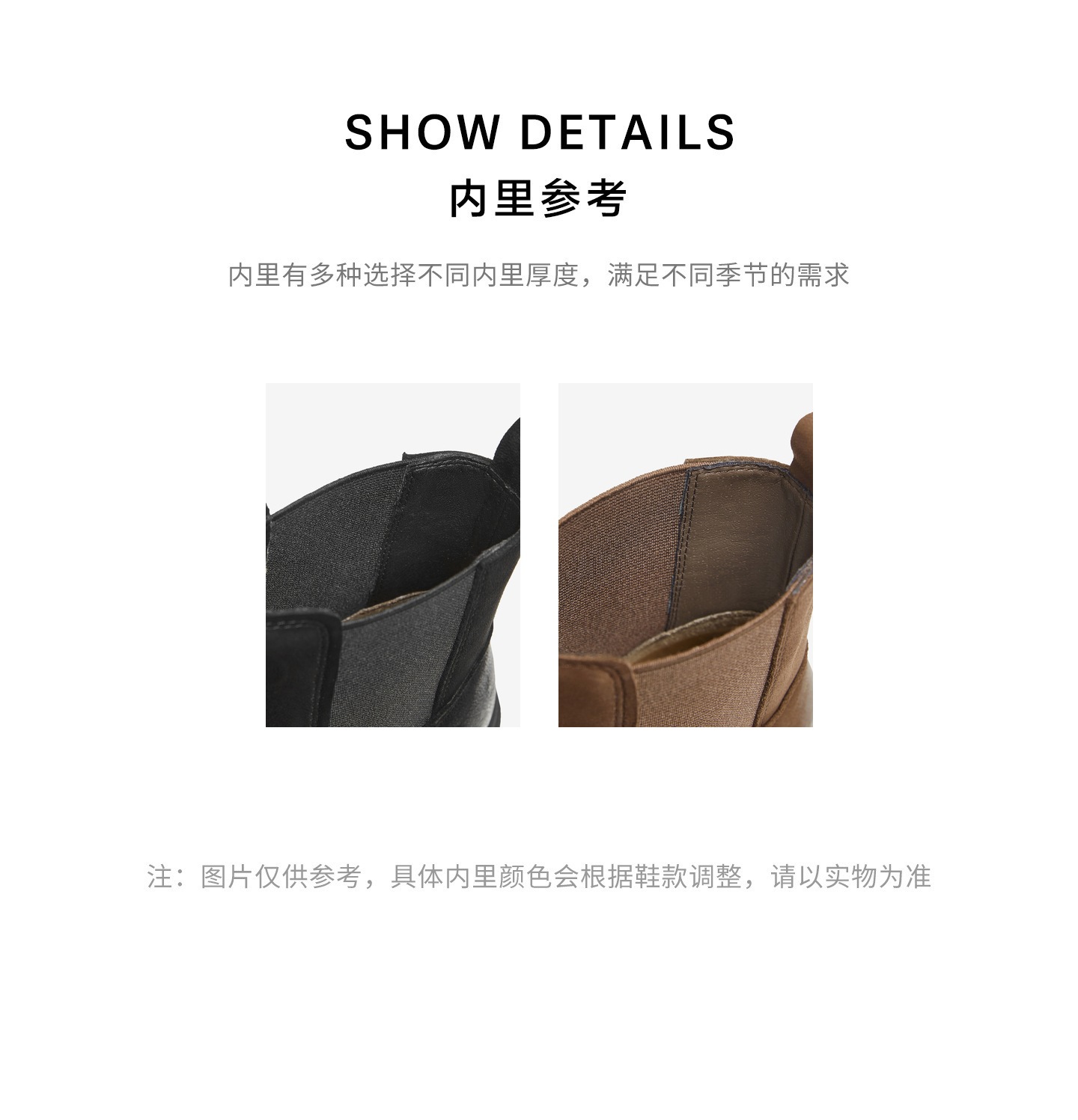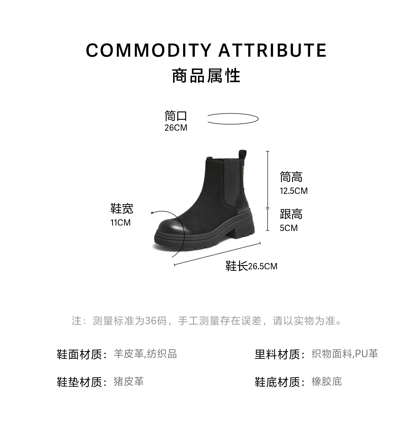 | 帮面材质:织物羊皮 | 配跟:有 | 靴筒口围:26CM | 上市时间:2025年冬季 | 鞋类流行款式:切尔西靴 |