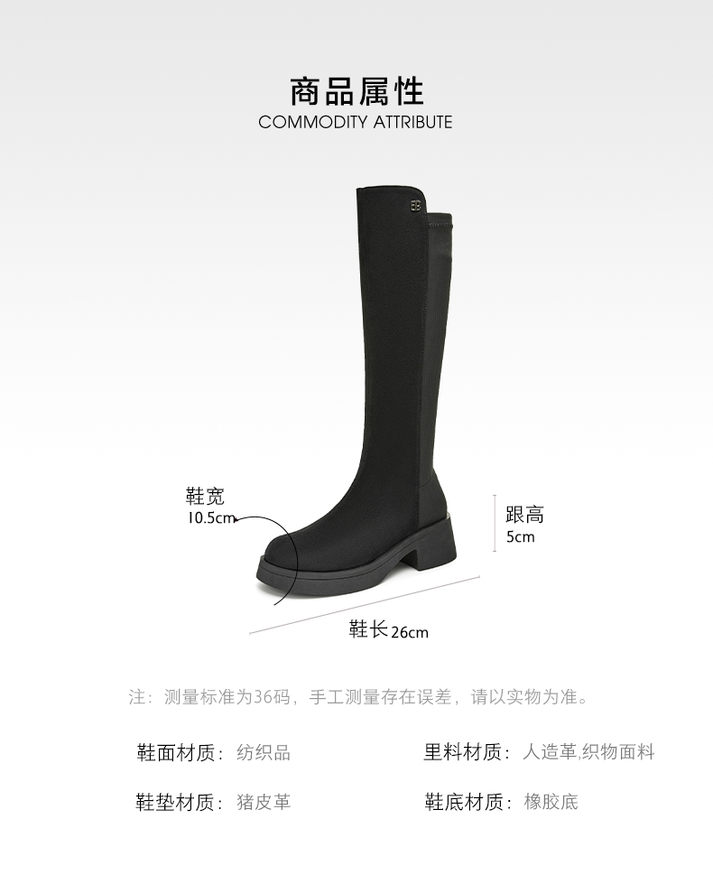 | 色系:黑色 | 参考标准尺码:36码 | 跟高数值:5CM | 筒高数值:35.5CM | 性别:女子 |